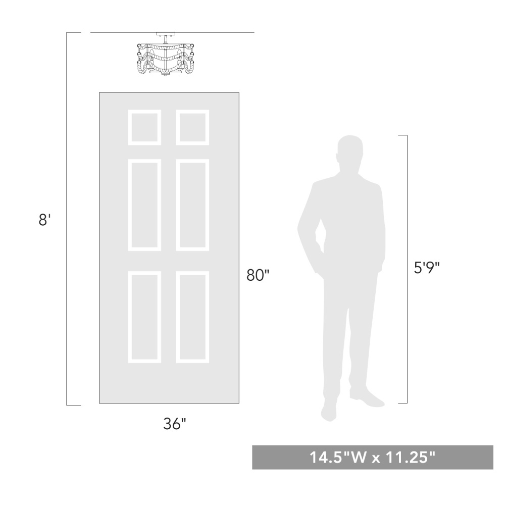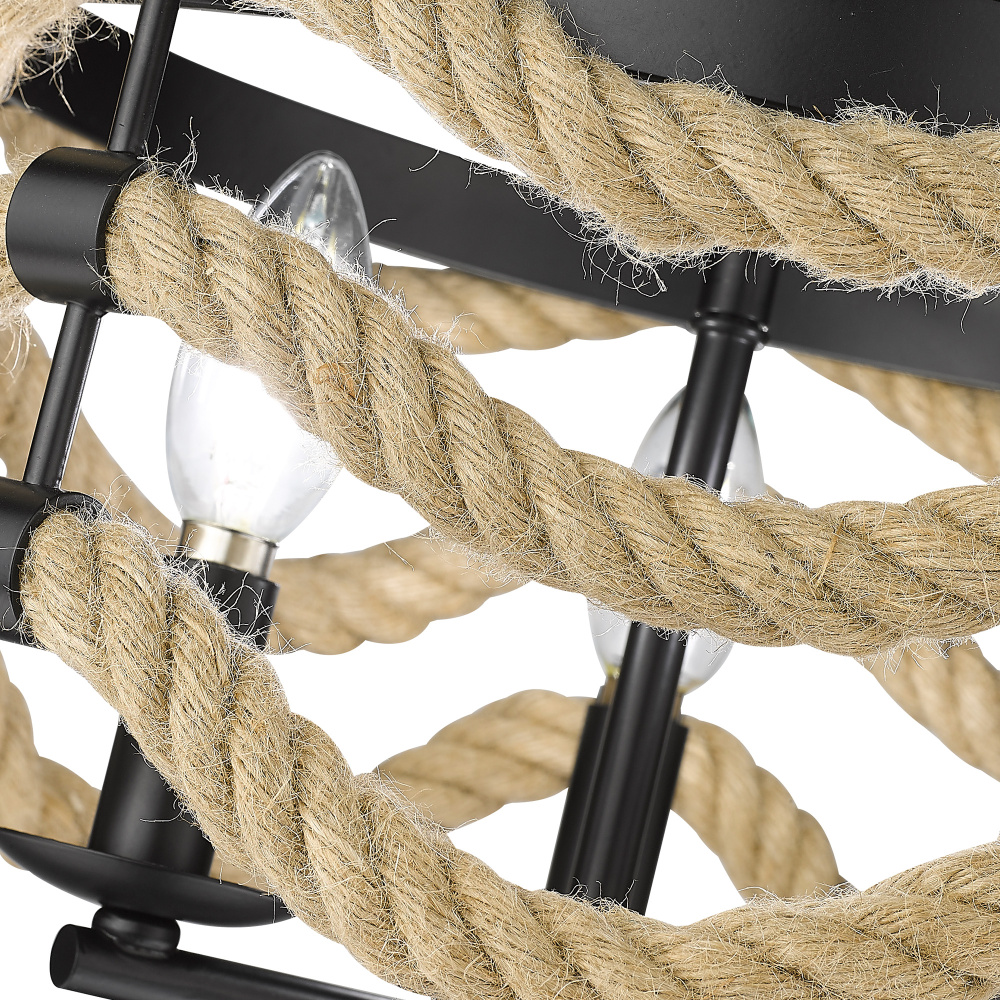 Bring coastal sophistication into your home with the Golden Lighting Marissa 3-light Semi-Flush Mount. Featuring a smooth, sleek design without a shade, this fixture creates a welcoming atmosphere and highlights its unique construction with thick, natural hemp rope intricately woven through the frame. The Matte Black finish epitomizes clean, modern style, offering a deep black color that enhances various decor themes from industrial to contemporary. Versatile for various settings, this semi-flush mount is damp location rated, making it suitable for entryways, bedrooms, kitchens, and other mid-height ceilings. It's designed for sloped ceilings, ensuring an easy installation. Dimensions: Overall Dimensions: 14.5"W x 11.25"H x 14.5"D. Requires 3 E12 Candelabra base bulbs (not included), with a maximum wattage of 60 per bulb. Close with the Golden Lighting Marissa, where quality craftsmanship meets modern design, perfect for adding a touch of coastal charm to your home.