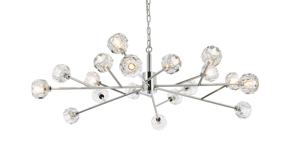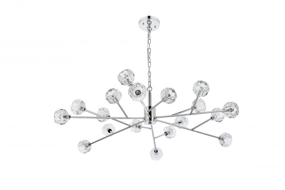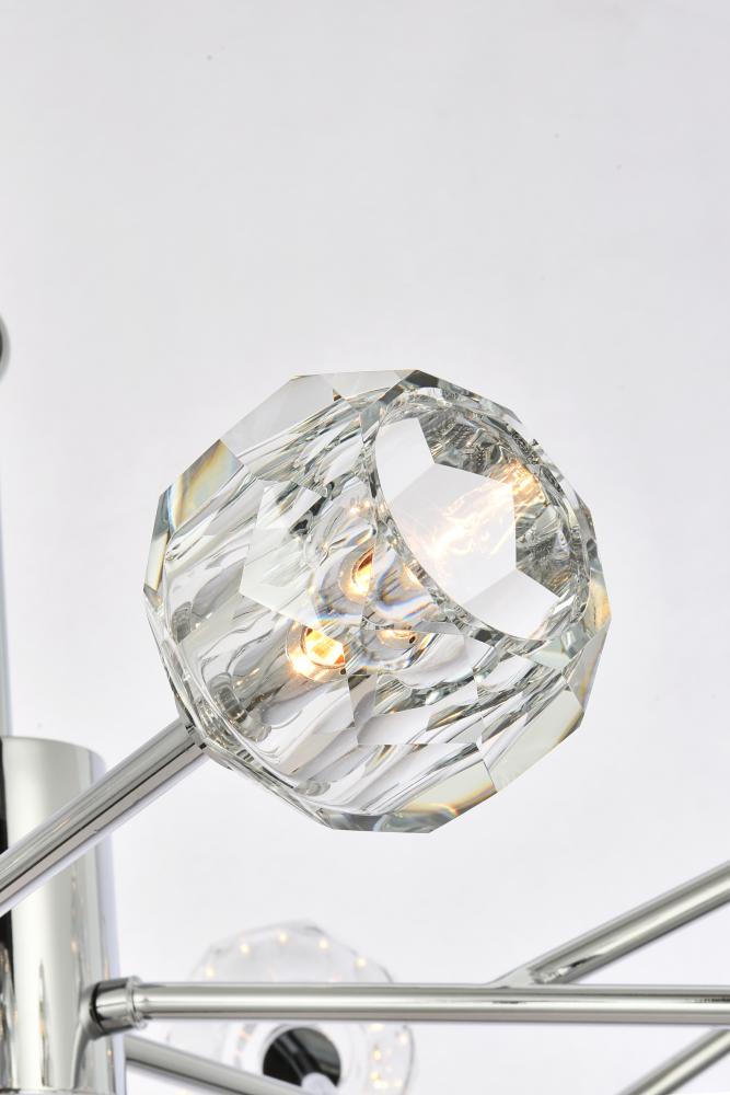 Crafted from iron metal and crystal, it features a round ceiling canopy, a 60 inch hanging chain, and arms extended with a solid K9 crystal ball from rods at all angles for a modern and linear look. Each 20W G9 bulb ( not included) is diffused by a faceted clear crystal ball giving the fixture a touch of industrial and glam inspiration. This work of art will add an artful focal point to your entryway, dining room, kitchen, or office. Evoking a sophisticated and timeless aesthetic to any space and will be an instant conversation started with its finely faceted crystal sphere which is polished by hand to reflect and refract light. Available in three different finishes in gold, chrome, and black.