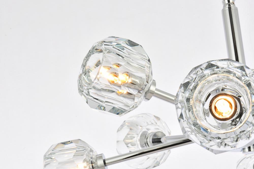 Crafted from iron metal and crystal, it features a round ceiling canopy, a 60 inch hanging chain, and arms extended with a solid K9 crystal ball from rods at all angles for a modern and linear look. Each 20W G9 bulb ( not included) is diffused by a faceted clear crystal ball giving the fixture a touch of industrial and glam inspiration. This work of art will add an artful focal point to your entryway, dining room, kitchen, or office. Evoking a sophisticated and timeless aesthetic to any space and will be an instant conversation started with its finely faceted crystal sphere which is polished by hand to reflect and refract light. Available in three different finishes in gold, chrome, and black.