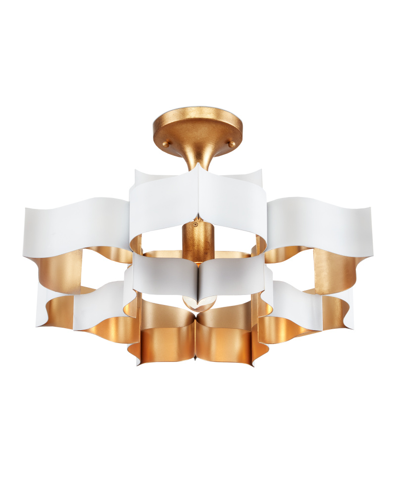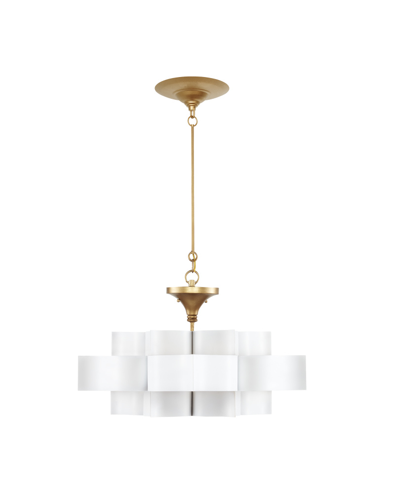 The Grand Lotus White Small Chandelier receives its good looks from a combination of stunning workmanship and a mix of sugar white and contemporary gold leaf finishes. The white chandelier is skillfully fashioned from wrought iron. Adjustable from 14" to 86" with use of included chain/rod kit/cable. If your space calls for a longer drop, additional chain/rods/cable is available for purchase.