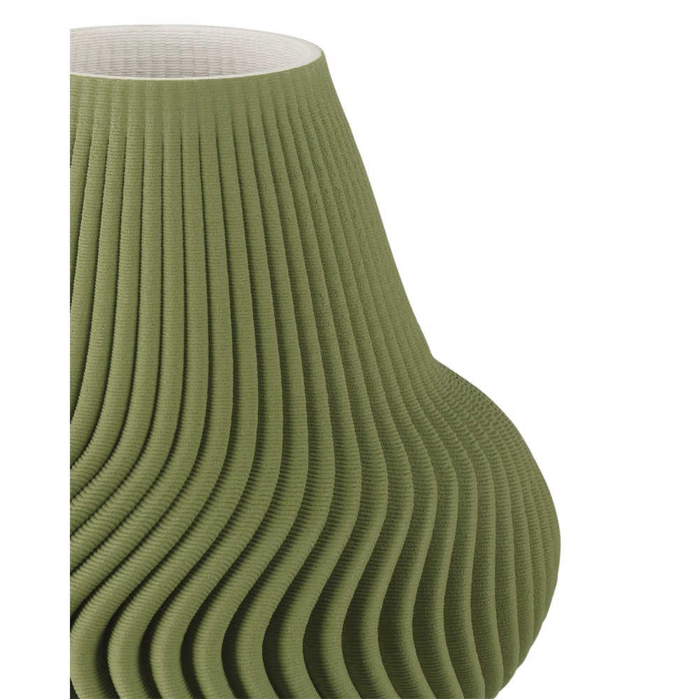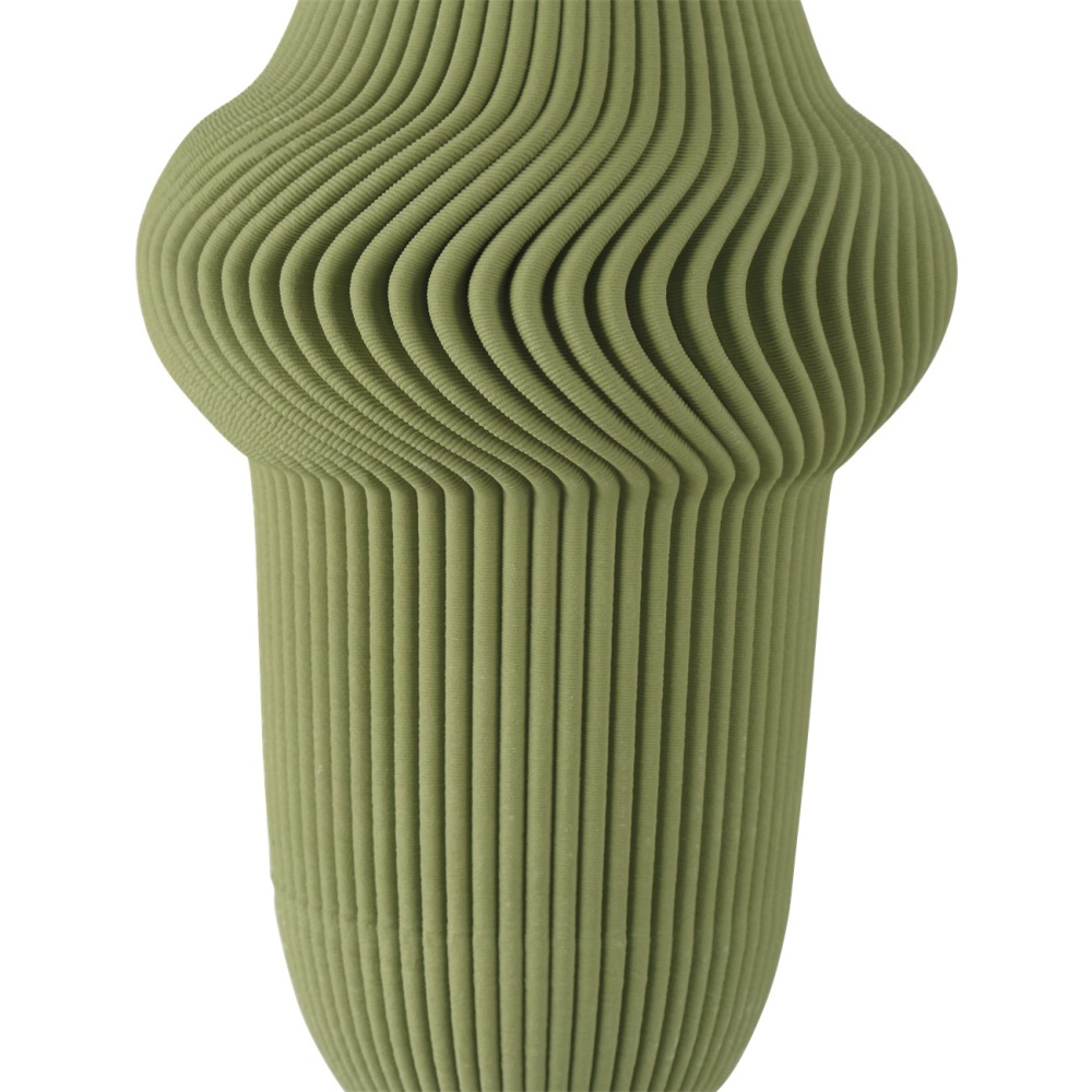 The Green Plisse Medium Vase is attractive in a lovely hue of olive green. The deep furrows that that swirl around the bulge in its form tighten and straighten as they flow to the top and to the bottom in a uniformity that can only be machine-made. The most surprising thing about this handsome vessel is that it is made of 3D-printed porcelain, an ancient material you might not expect to be so amenable to such a contemporary process.