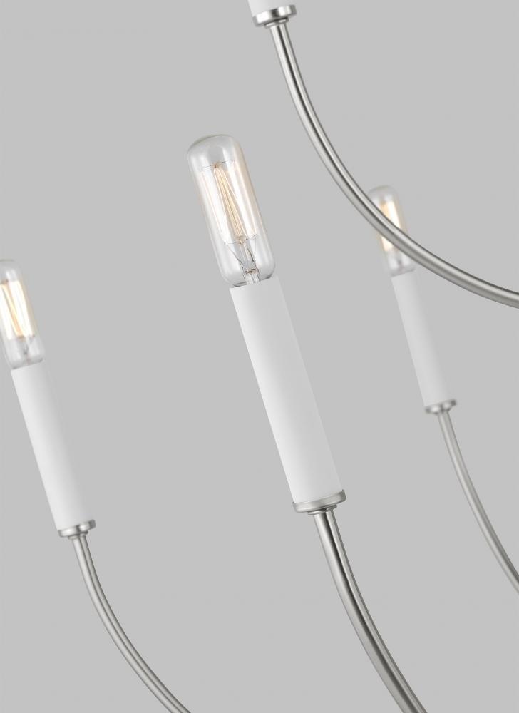 Airy and light, Greenwich is the epitome of the less is more approach to design. The open J arm frame with matching or contrasting cream candle tube accents the soft curves of the frame beautifully for a dramatic impact. This collection can also accommodate shades for more refined styling. Assortment includes a one-light sconce, -five and -nine chandeliers