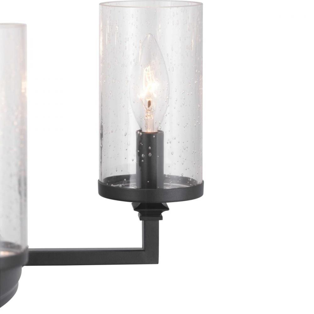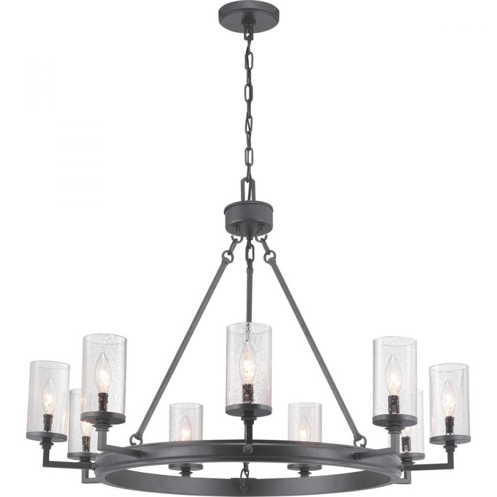 Graphite finishes and organic seeded-glass shades form the basis of this collection that channels traditional iron structures;This round nine-light chandelier is ideal for a dining room or large breakfast area;This fixture feels most at home in a tradition