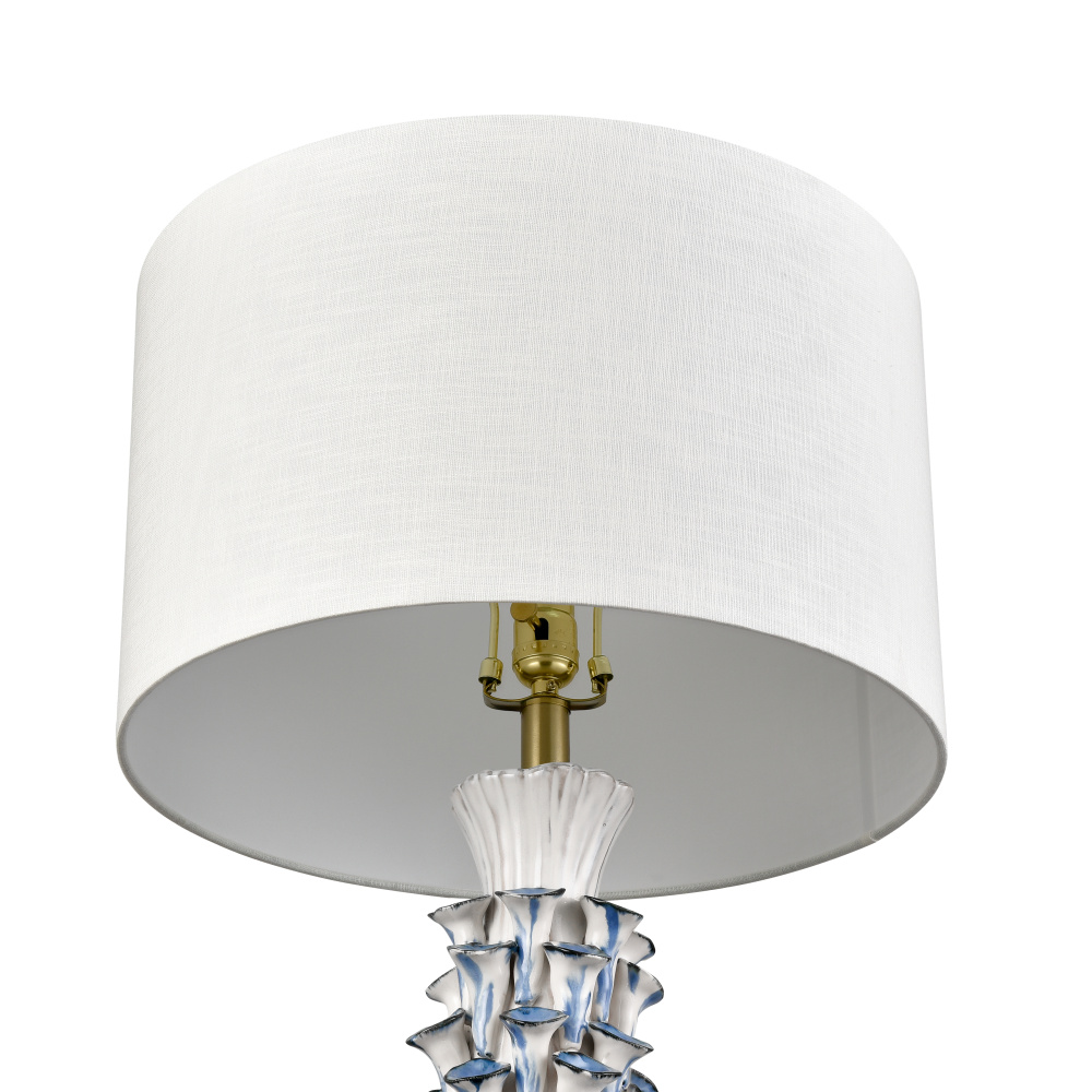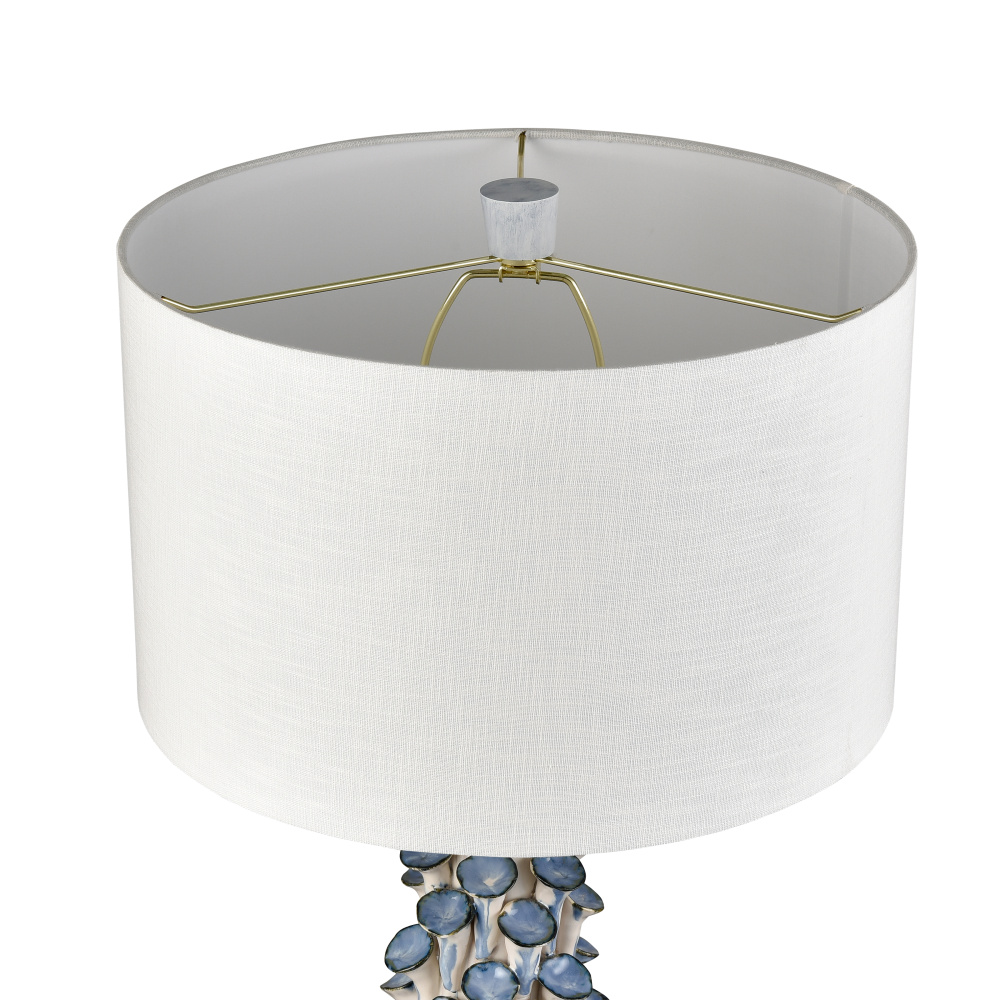 The Habel Table Lamp has a gently tapered cylindrical ceramic body covered in tiny hand-applied blue trumpet shapes that mimic the look of ocean flora. A white textured linen drum shade completes the look.