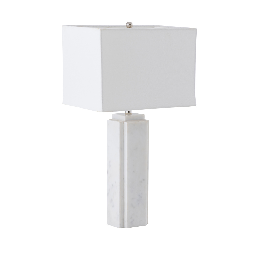The Hale Table Lamp features a white and grey veined marble base in a square column shape with cut-out corners. Natural striations and color differences in the base reflect the dynamic look of authentic marble. A white rectangular hardback shade completes the look of this small-scale lamp.