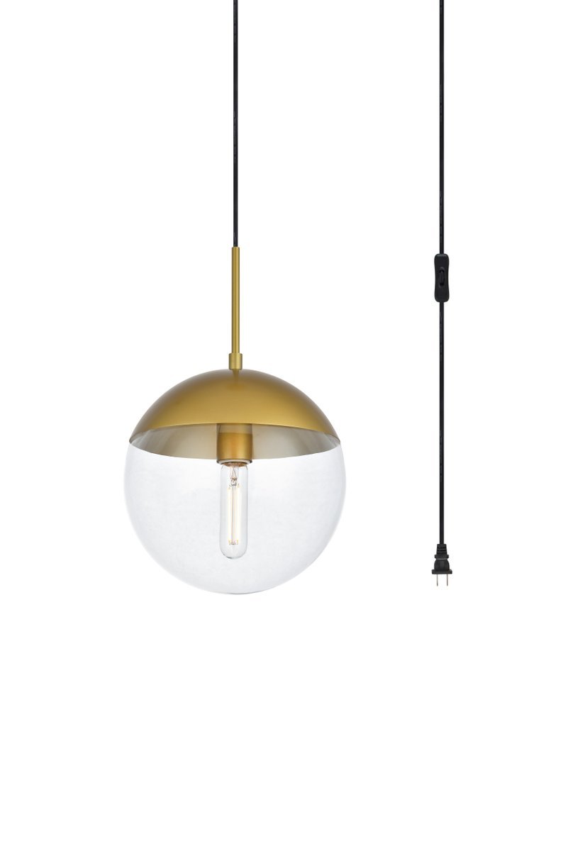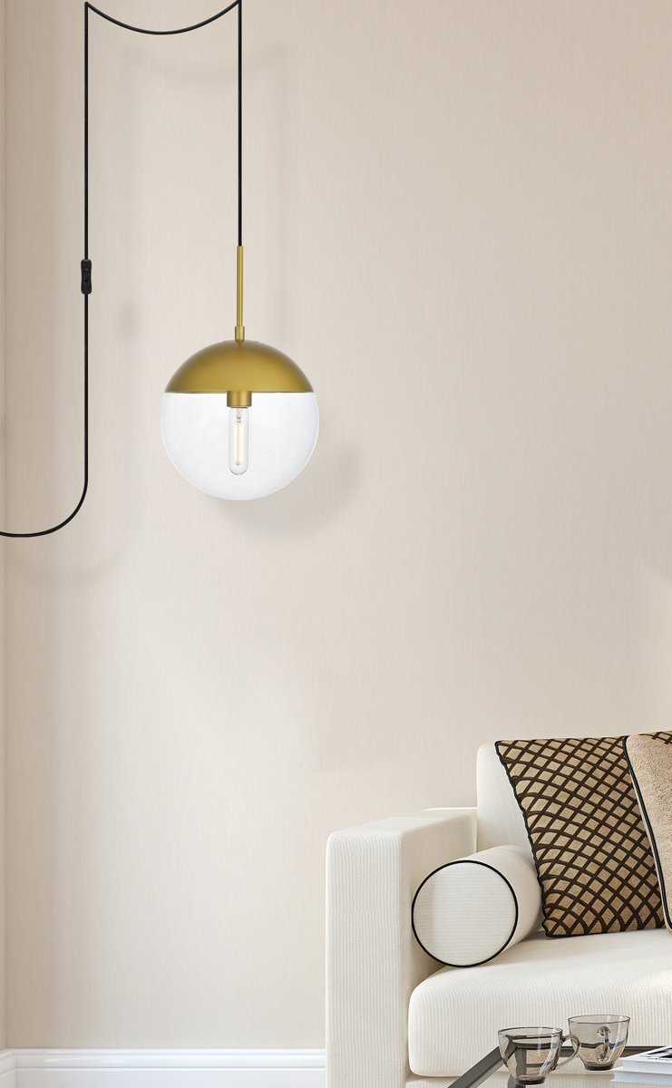 Refined style with a practical design, Eclipse plug in pendant lamps bring cosmopolitan sophistication anywhere, especially to an entryway, office, bathroom, bedroom, or kitchen. The smooth iron round frame comes in a brass finish. A 15 foot black cord allows you to vary the hanging height off the swag hooks. Since this is a plug-in you can move it around easily to add light wherever you go. A touch of color on top of the clear spherical glass shade brings character to this classic style. Living in the big city has never been this easy. Simply hang this piece on the provided swag hooks and plug it in for an effortlessly easy installation - can be hung from a sloped or vaulted ceiling.