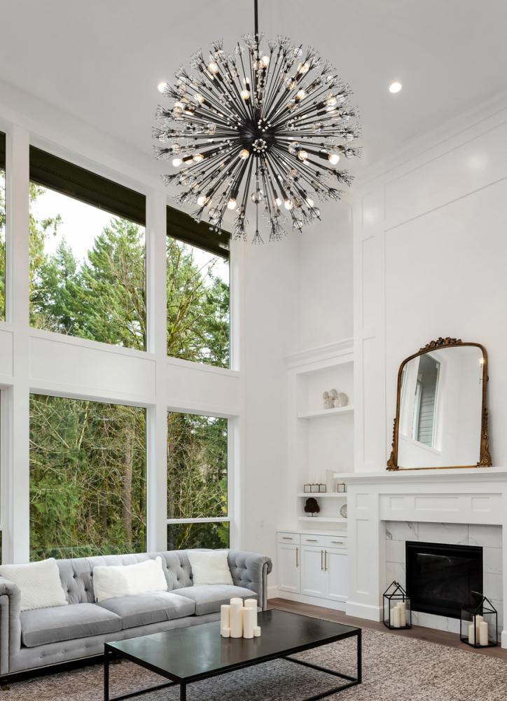 Features a striking sputnik-style shape with sparkling crystal accents for a luxurious modern touch.