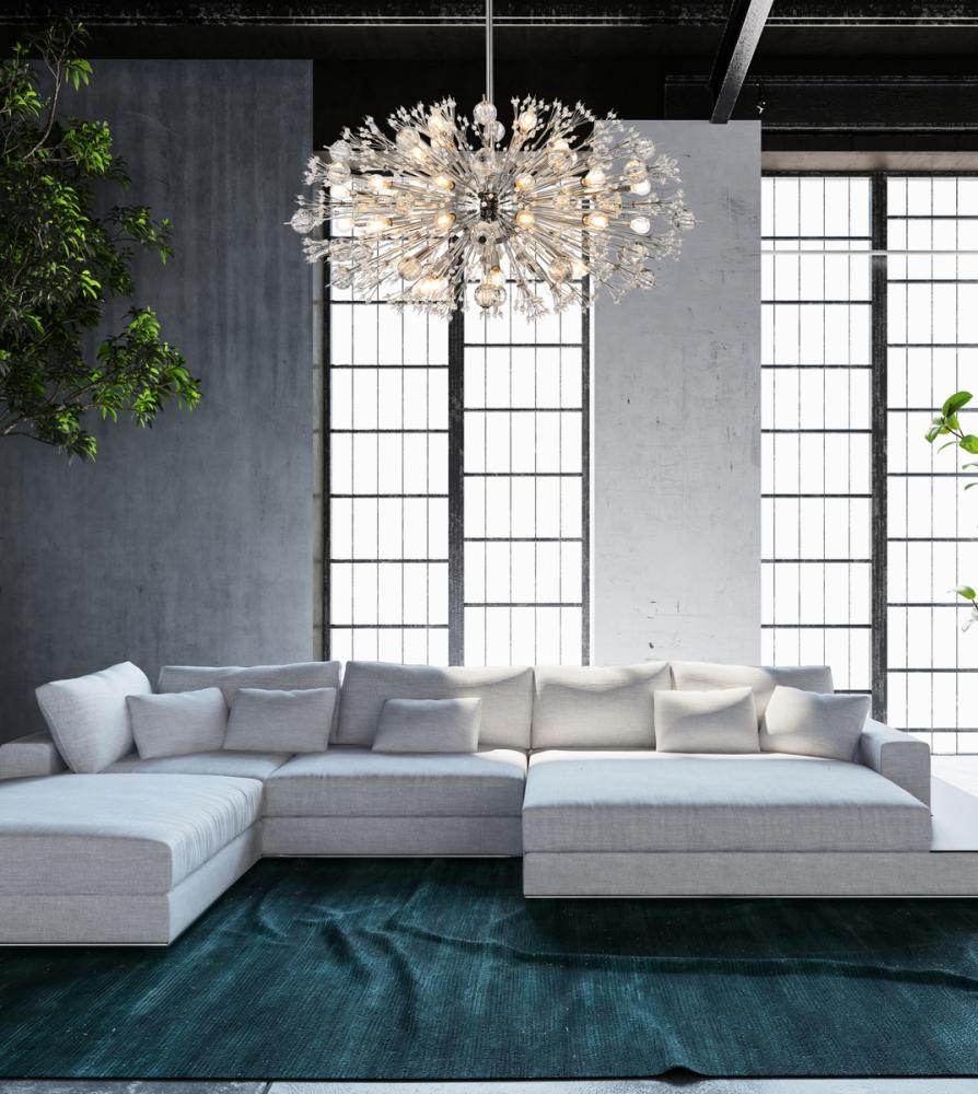Features a striking sputnik-style shape with sparkling crystal accents for a luxurious modern touch.