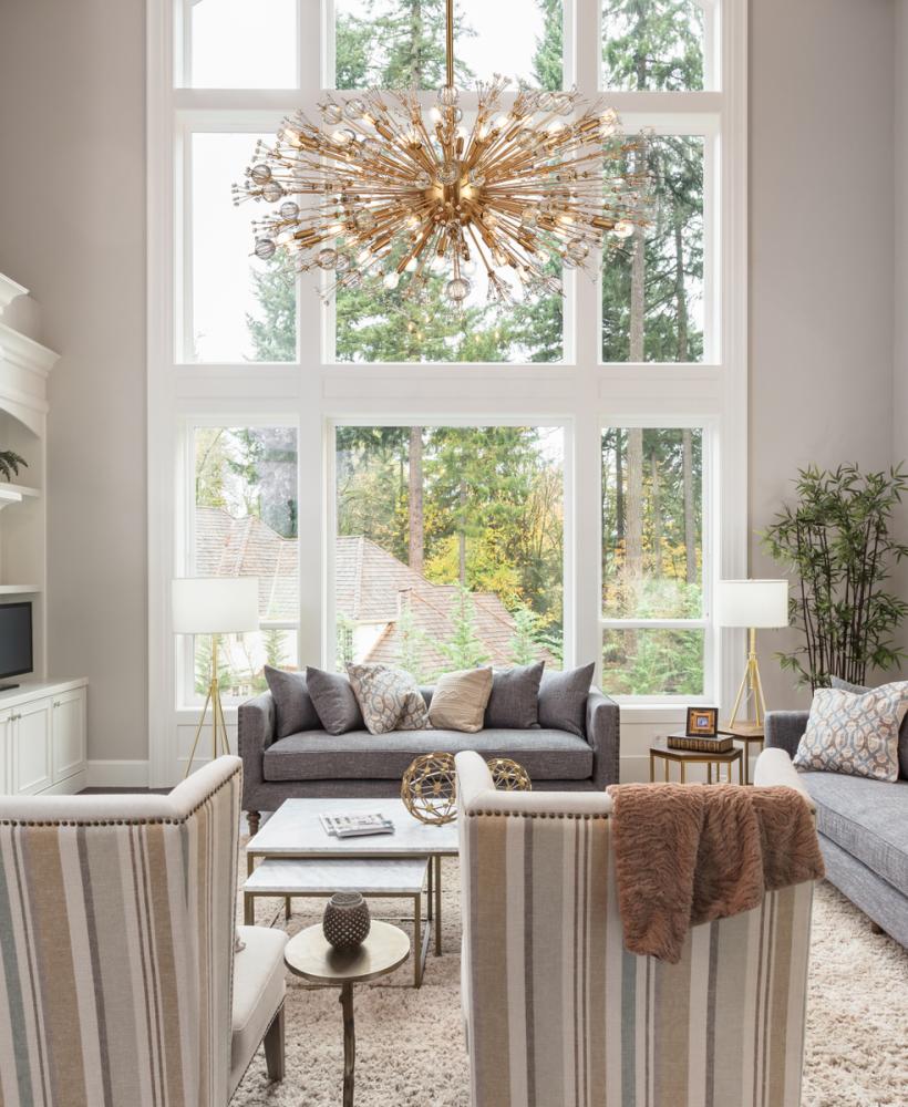 Features a striking sputnik-style shape with sparkling crystal accents for a luxurious modern touch.