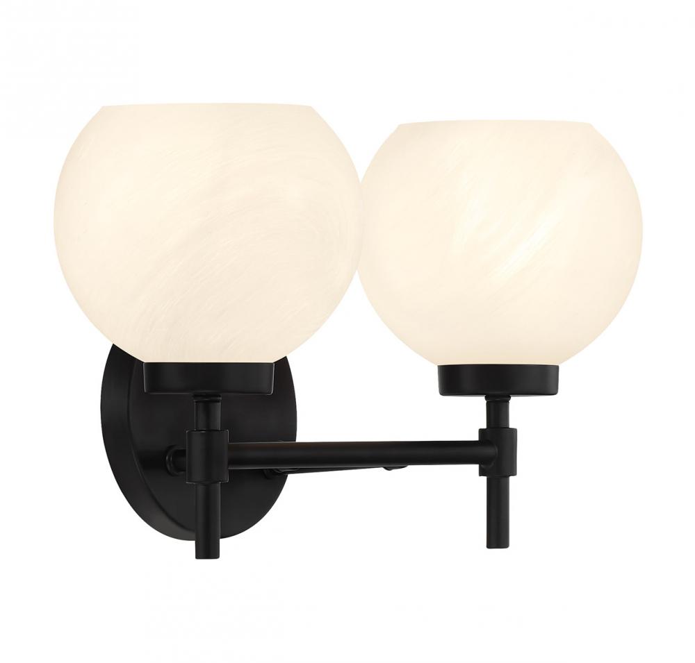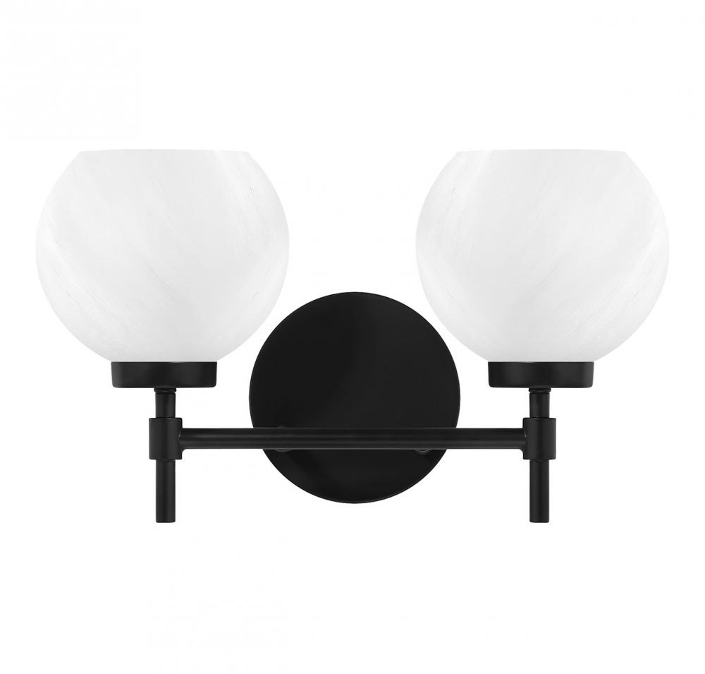 Bring vintage-inspired lighting to your bath with the bright and beautiful Hannah 2-light bath light. Shades of white strie glass feature eye-catching wisps and swirls that add a touch of dimension and intrigue. The streamlined structure, finished in Matte Black, allows the magic of the strie glass to take center stage. Hannah is 8" in height, 16" in width and extends 7" from the wall. Uses two standard size bulbs of up to 60 watts per bulb. Bulbs not included. This bath light is damp area rated and may be installed with the glass facing up or down.