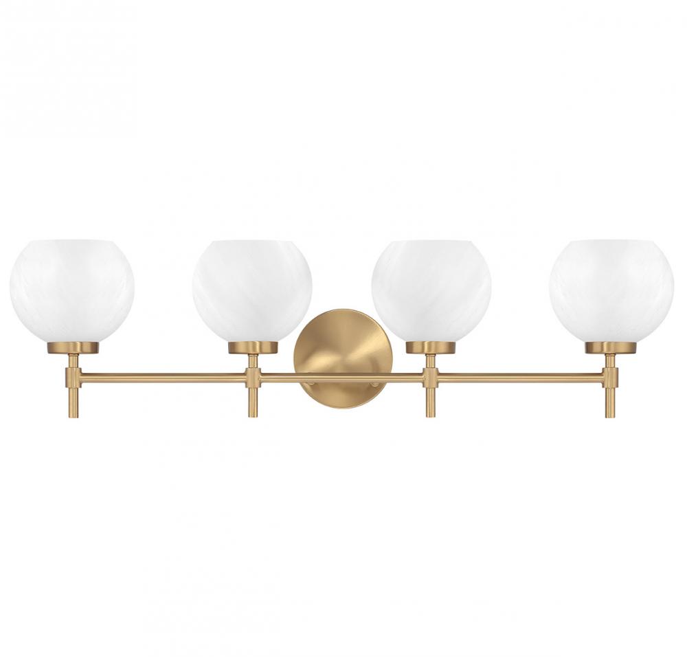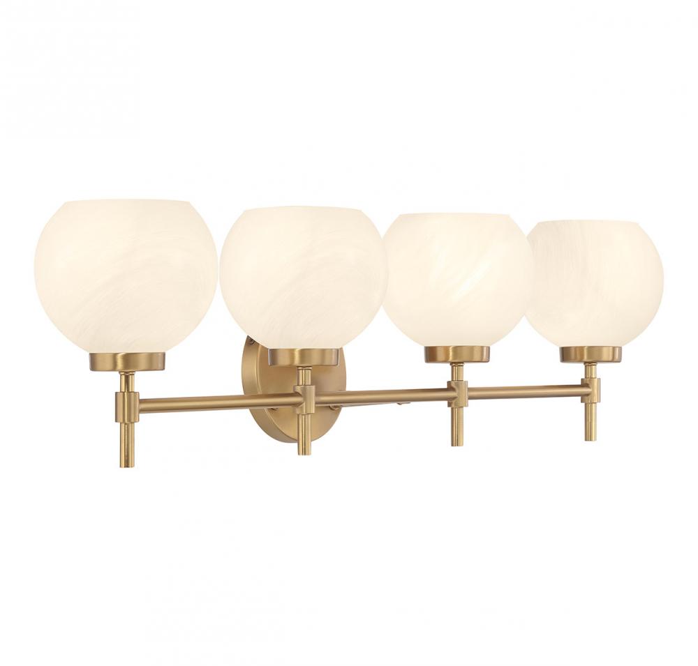 Bring vintage-inspired lighting to your bath with the bright and beautiful Hannah 4-light bath light. Shades of white strie glass feature eye-catching wisps and swirls that add a touch of dimension and intrigue. The streamlined structure, finished in Warm Brass, allows the magic of the strie glass to take center stage. Hannah is 8" in height, 32" in width and extends 7" from the wall. Uses four standard size bulbs of up to 60 watts per bulb. Bulbs not included. This bath light is damp area rated and may be installed with the glass facing up or down.