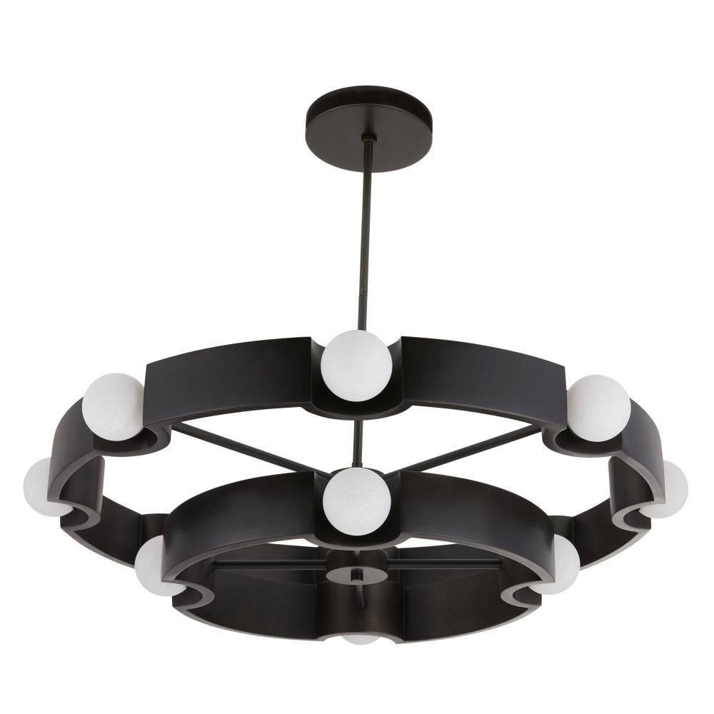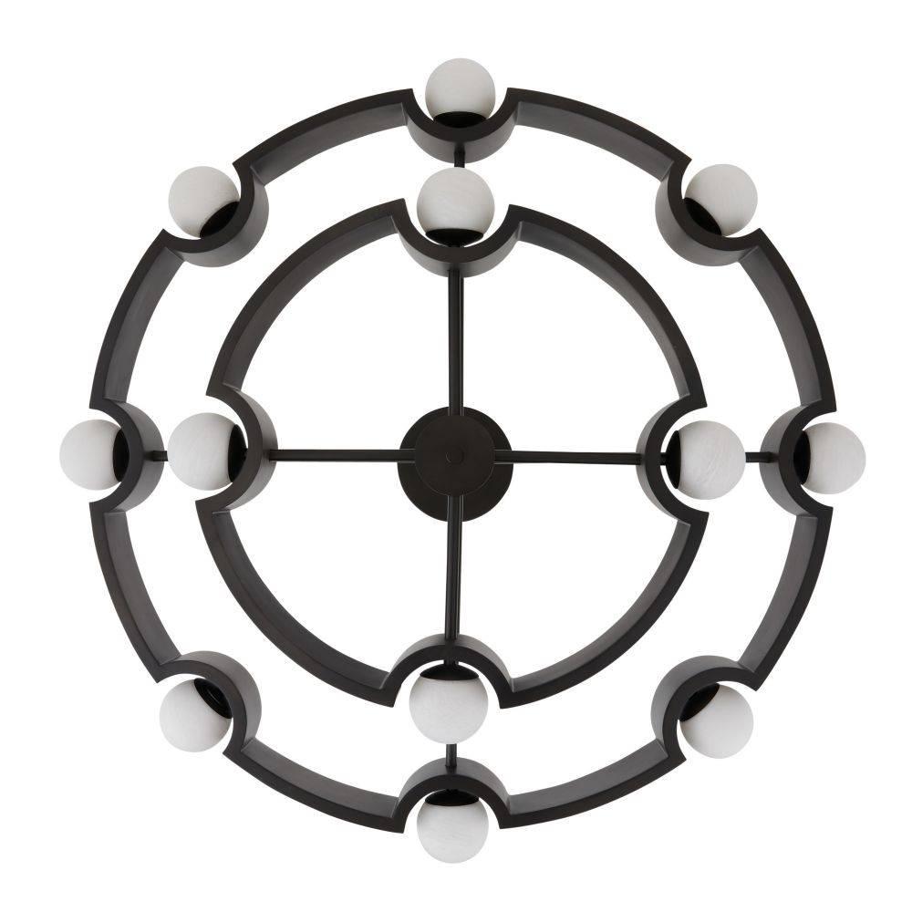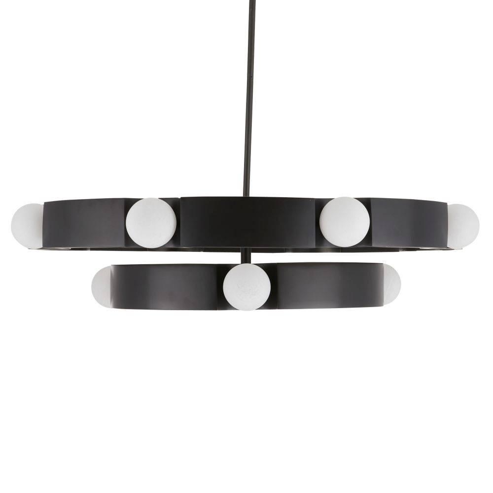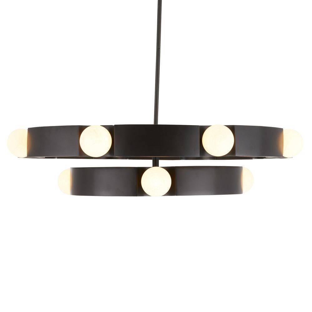 Our jewelry-inspired drum shade delivers a double dose of light. Reminiscing ribbons wrapping around pearls, globes of matte swirl glass are mounted on two English bronze-plated iron tiers suspended from a slim pipe. Twelve integrated LED bulbs. Damp-rated, although limited covered outdoor areas may affect finish.