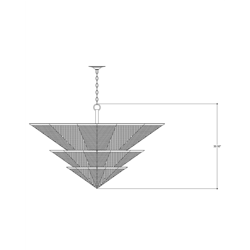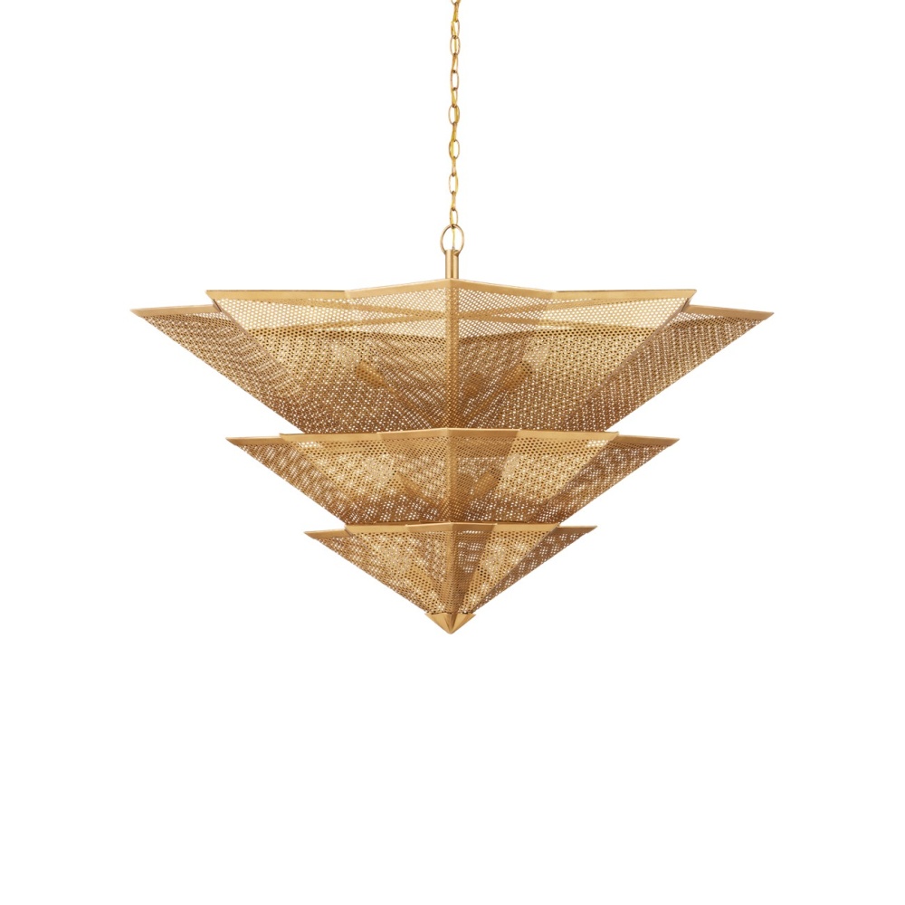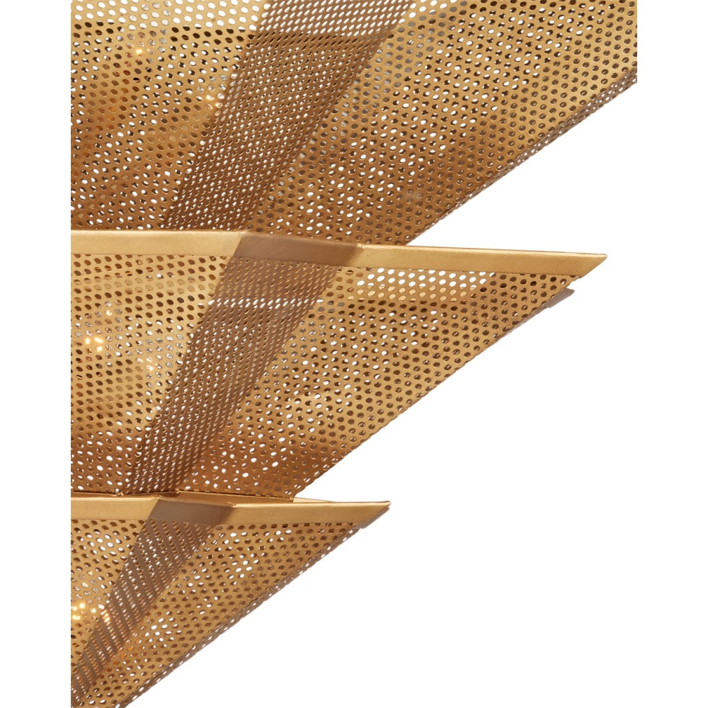 Torpedoing down from the ceiling, our Hanway Chandelier is a masterful composition made of perforated wrought iron sheets in an antique gold leaf finish. Fans of industrial design will see the artistry in the bending of these sheets and the quality of the folded edges that make this gold chandelier so powerfully designed. Adjustable from 37.5" to 104.5" with use of included chain/rod kit/cable. If your space calls for a longer drop, additional chain/rods/cable is available for purchase.