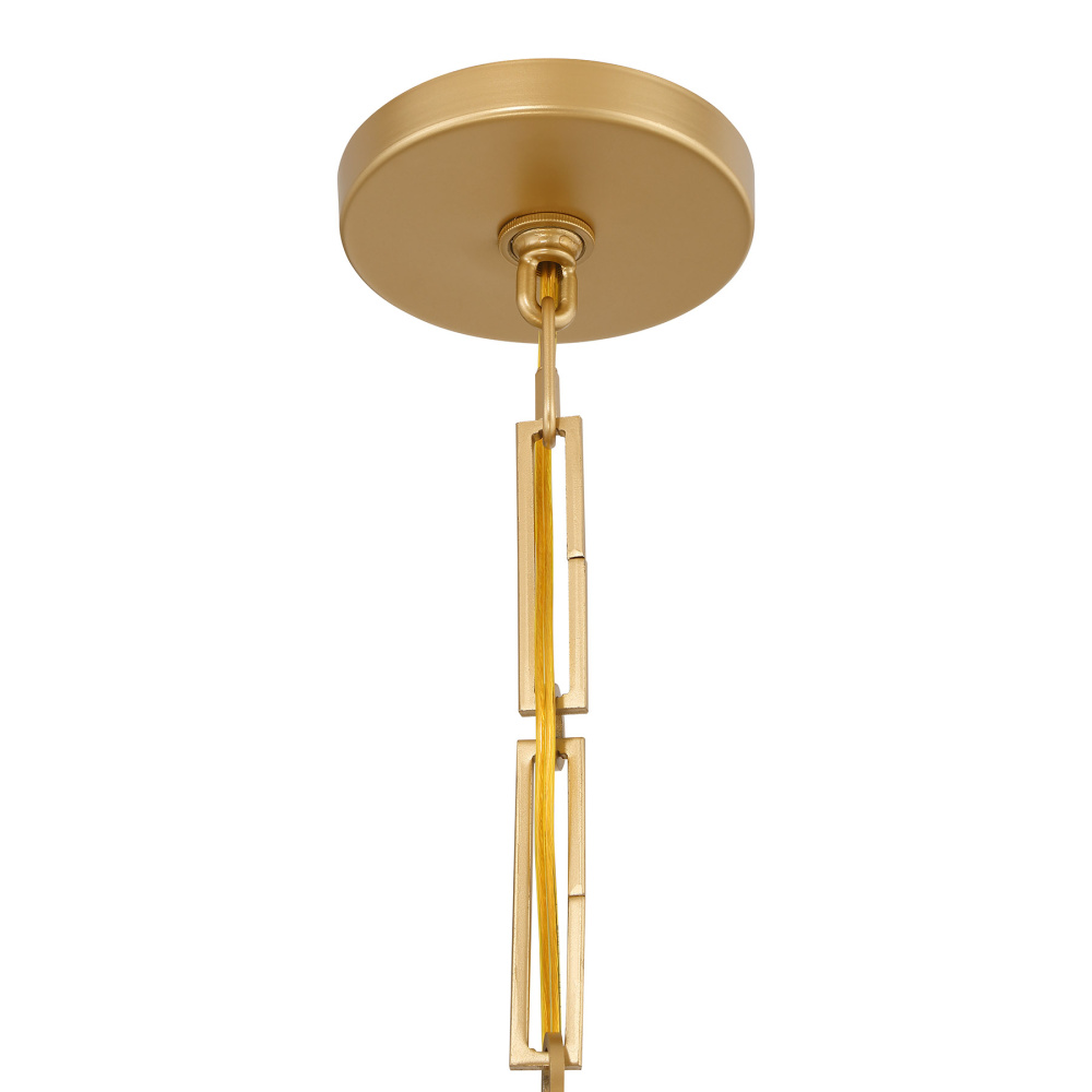 Get geometric elegance like no other when you get the Savoy House Harding 1-light pendant. An orb of opal glass is held within a sleekly structured frame that expertly combines ovals with rectangles. The shape of the frame is reflected in the hanging chain, too! A Spun Gold finish adds shimmer and shine. Harding is 28" in height and 16.5" in width. It uses one standard size bulb of up to 60 watts. Bulb not included. Comes with 120" of chain and 144" of cord.