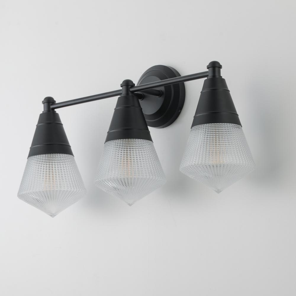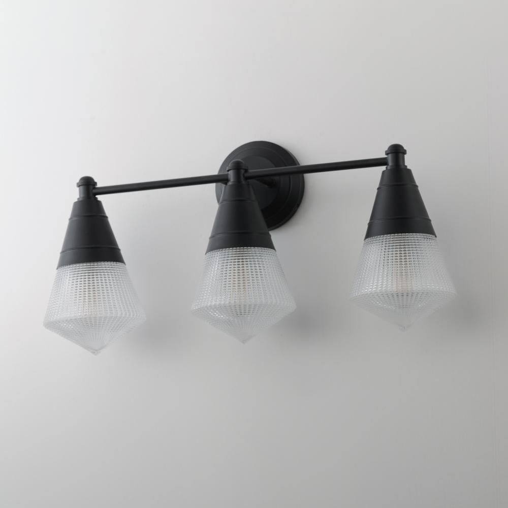 A prismatic diffusion of light is housed within pressed cone glass shades. Choose from pendants with tapered metal halves that conceal the light source or glass shades that are supported by a metal ring. Coordinating bath vanity lights complete the collect