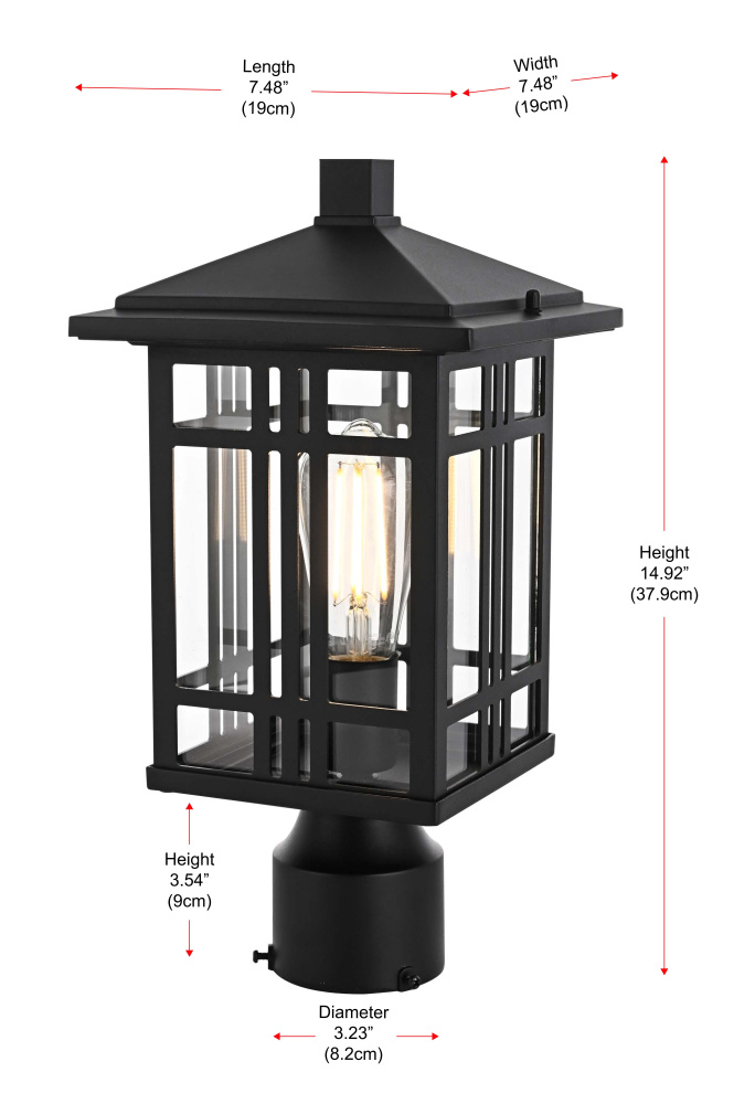This post light structured rectangular frame with a decorative grid pattern, creating a defined, architectural presence for exterior spaces. Made from iron and aluminum, the durable black-finished frame ensures long-lasting performance. The black-finished iron and aluminum construction ensures durability, while the fully enclosed bottom design helps protect the bulb from dust and outdoor debris. The clear glass panels maximize illumination, making this fixture both practical and visually striking. Designed to fit most standard 3.23-inch post light poles (pole not included), this fixture is dimmable when paired with a compatible dimmer, offering adjustable brightness for different outdoor settings. ETL Wet Rated for outdoor durability, this structured and modern post light is a strong addition to driveways, pathways, and garden landscapes. Built with marine-grade, corrosion-resistant aluminum, this sconce withstands coastal conditions for long-lasting durability.