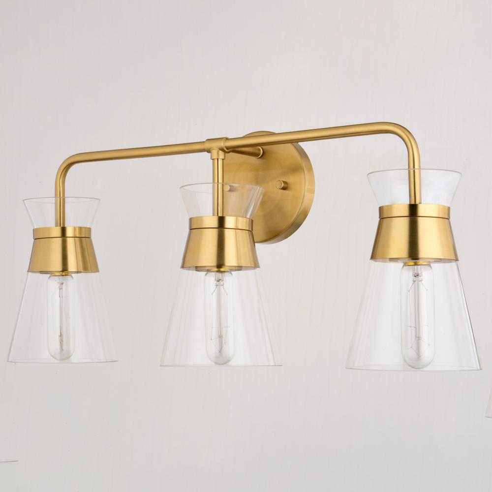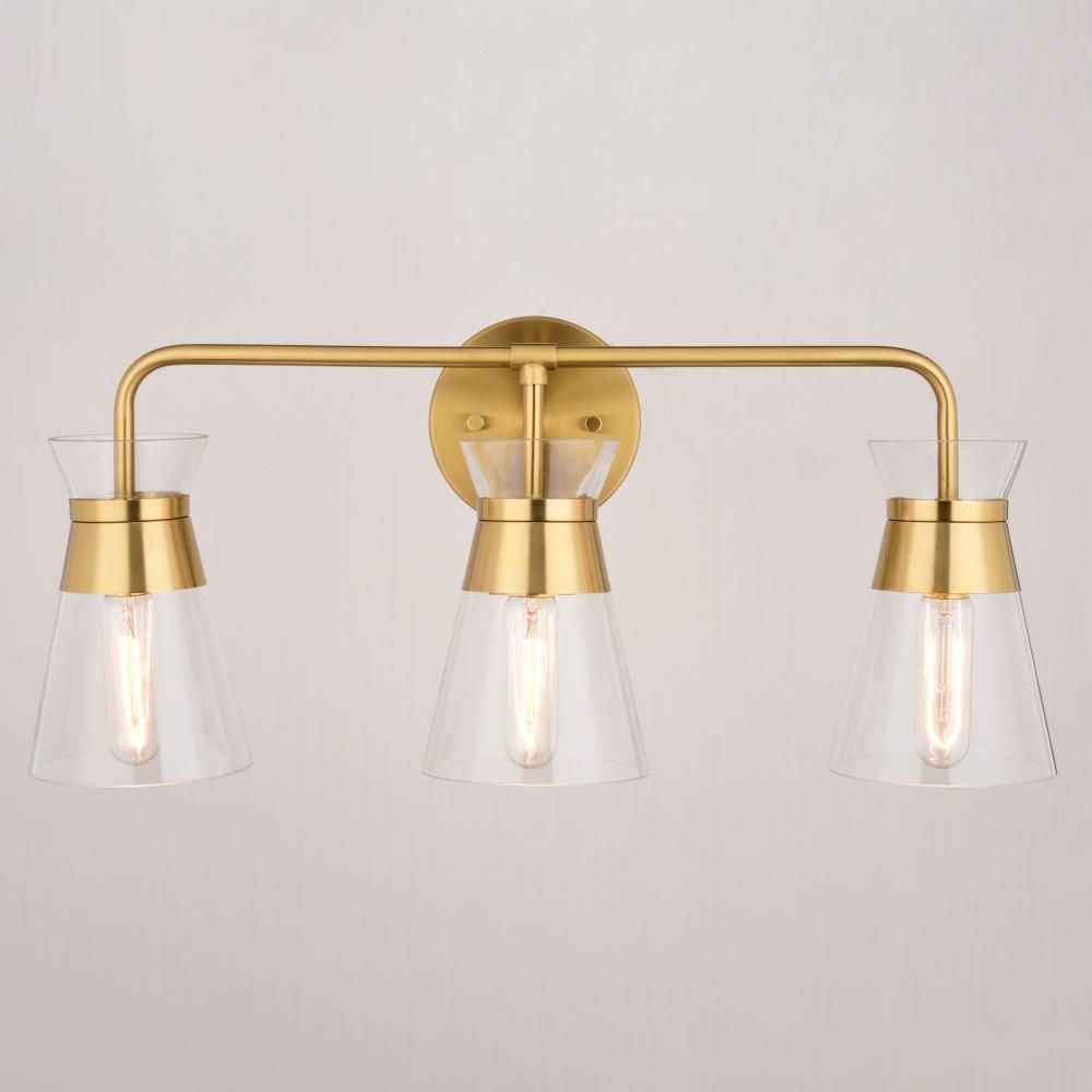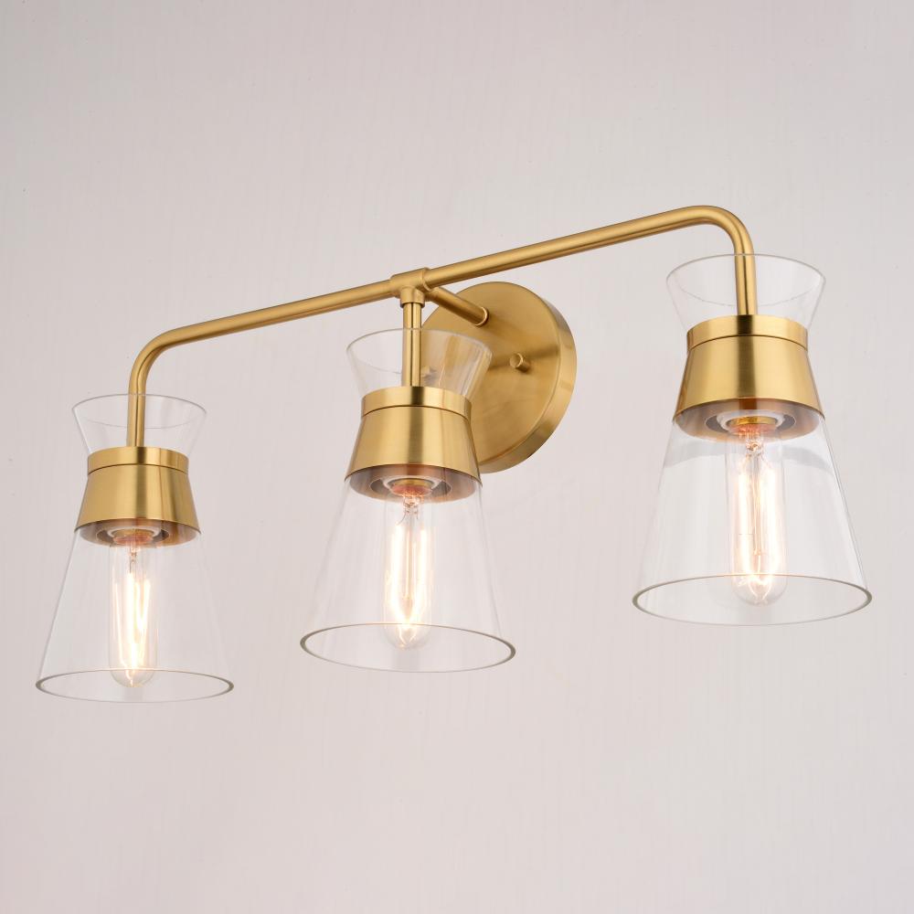 Indulge in mid-century modern charm with the Harper 3-Light Vanity. Its sleek, bowtie-inspired design and natural brass finish bring a touch of warmth and sophistication to your bathroom or perhaps even your kitchen. The clear glass shade beautifully showcases your choice of bulb, creating a captivating focal point.