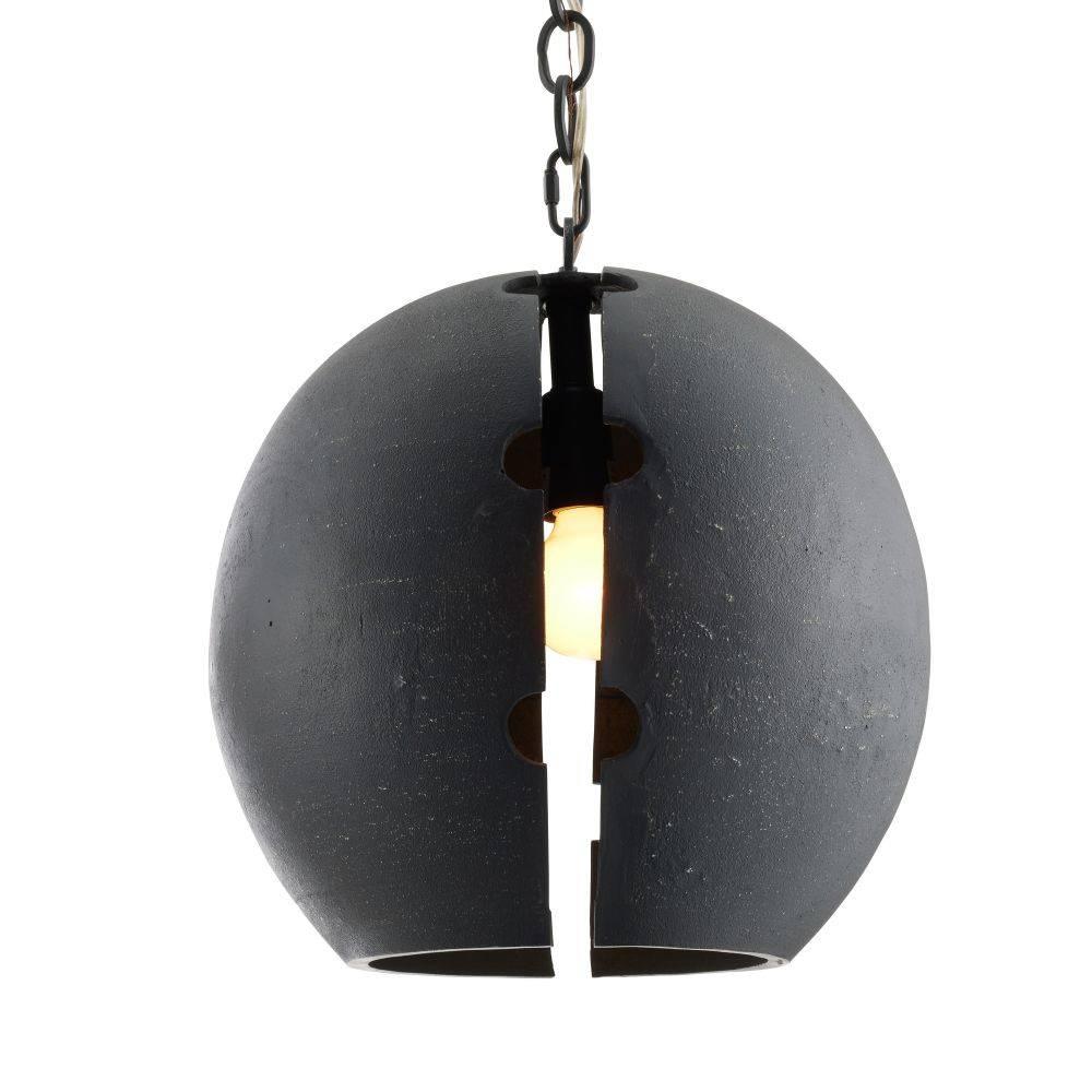 Inspired by an Indian bell, the dome form of the Hartland has the look of an ancient found form. Cast of aluminum in textured matte charcoal, the finish lets a hint of underlying silver peek through. The overscale shade's demi-lune cutout allows the bulb to disperse light with an exciting play of shadow. Damp-rated, although limited covered outdoor areas may affect finish. Finish will vary.