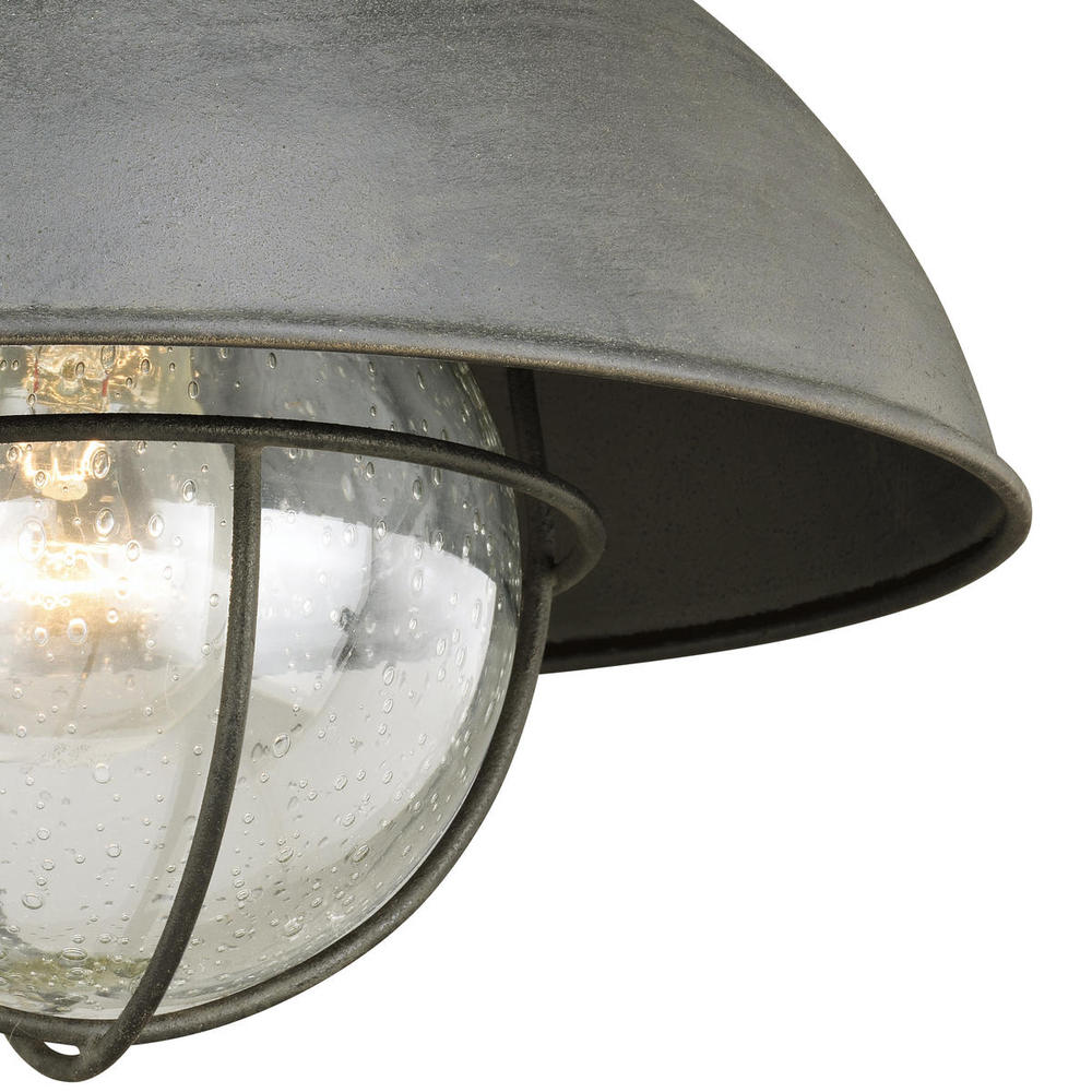 The Harwich flush mount barn light features a textured gray finish with clear seeded glass shade. Its iconic nautical-style is at home in a cottage, country or coastal setting and is exactly what is needed to add style and distinction to any entryway, porch or patio area.