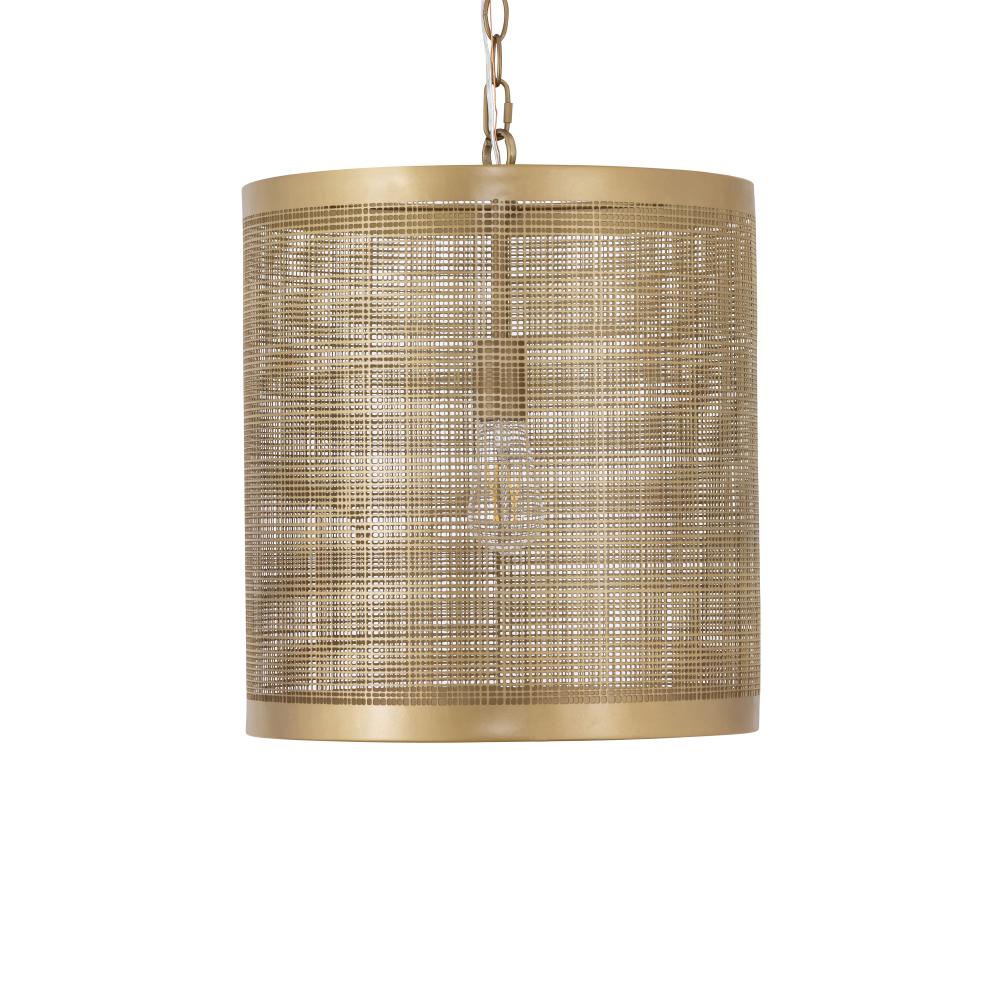 A crosshatching etched pattern on metal shades finished in Gold or Matte Black powder coated finishes. Available in multiple sizes of pendants and matching ADA compliant wall sconce.