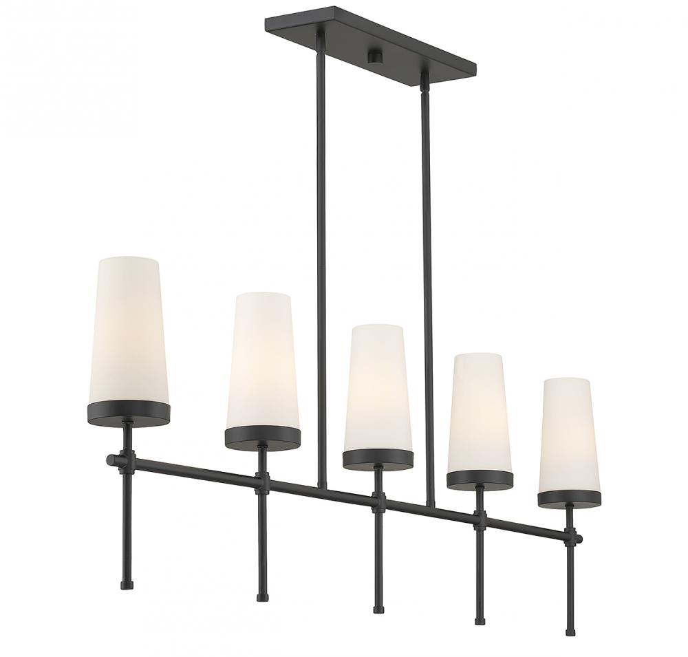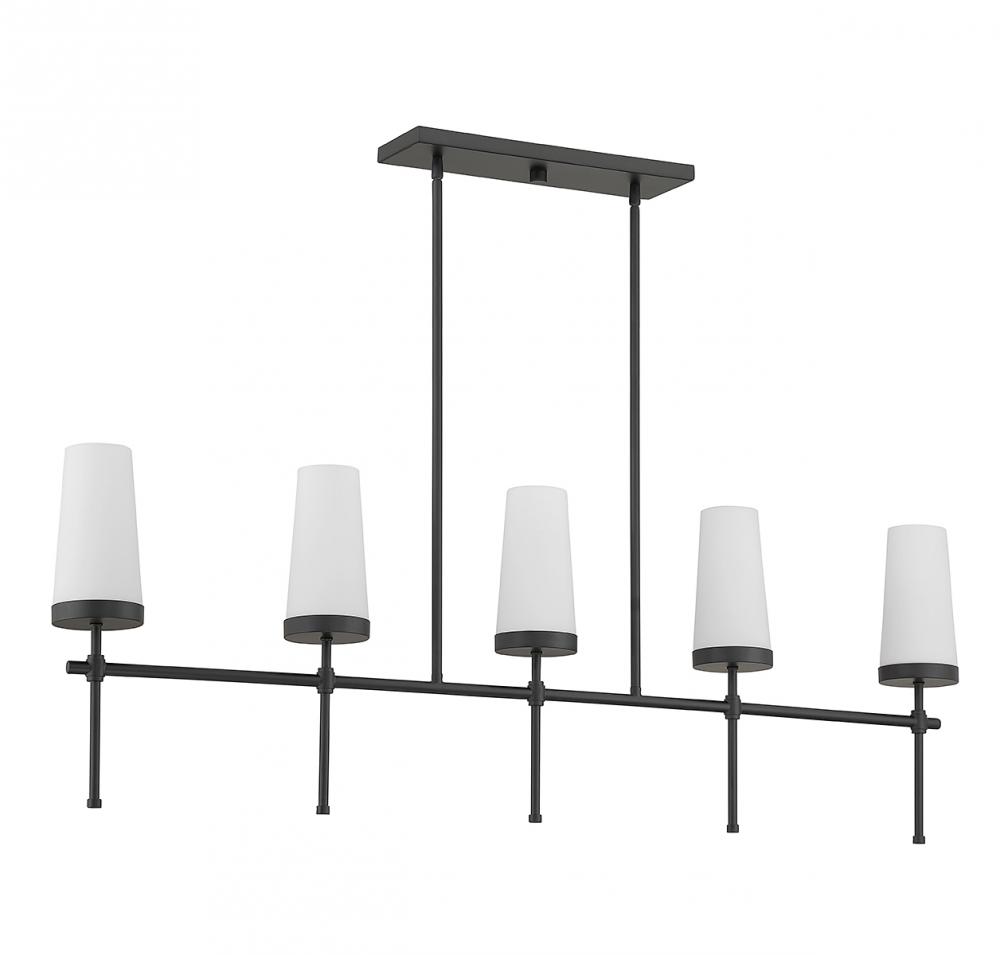 Whether you want to brighten up a dining room, illuminate a kitchen island or create a stylish game room, the classic Savoy House Haynes 5-light trestle is a great choice. Its tall, tapered white opal glass shades create a bright yet comfortable glow. The matte black finish goes with anything. It is 48" in length, 4" in width and has an adjustable height ranging from 16.5" to 70". Comes with eight 12" downrods and two 6" downrods. Uses 5 candelabra size bulbs of up to 60 watts per bulb (bulbs not included).