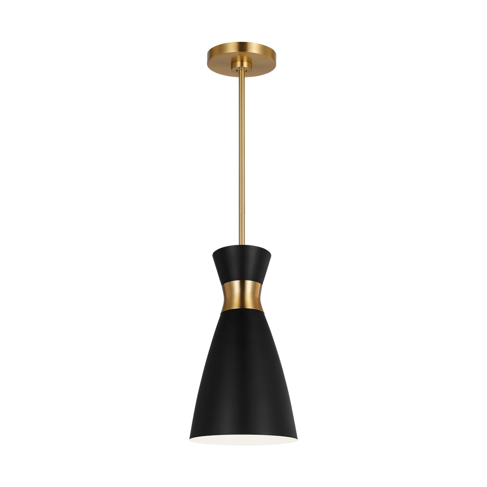 Heath is a chic pendant crafted of metal and a center wrap detail. The cleanness of the contemporary look gives the fixtures a slightly industrial feel. Available in wide or narrow design options. Notice how the top and bottom frame contrast with the metal band. The Heath one light indoor pendant in Midnight Black with Burnished Brass features modern mid-century refinement and luxe materials for a minimalist aesthetic.