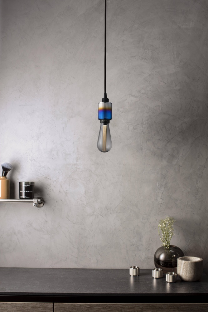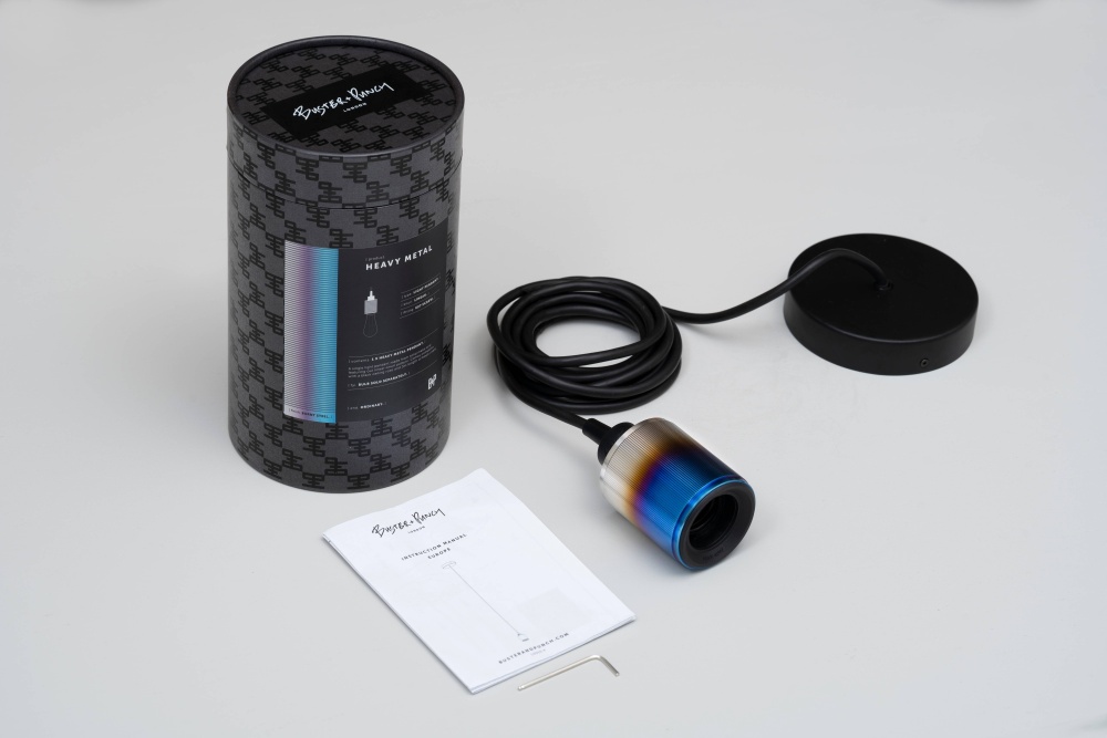 "A light pendant made from solid stainless steel and exposed to excessive heat to create our unique burnt steel finish, featuring our signature, diamond-cut, linear-knurl pattern. This light has an E26 bulb socket and comes with matt black rubber cord and a matt black ceiling rose. The light looks best when teamed up with one of our LED BUSTER BULBS."