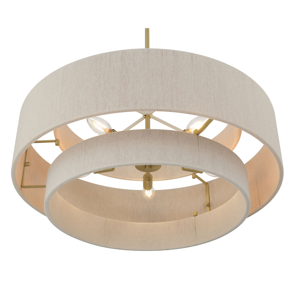 The Helbert Collection of pendant and flush mount lighting is peak Mid-Century design with a modern flair. Featuring tightly woven, natural hemp shades that allow for wonderful light play, these fixtures blend an organic profile with sleek modern lines perfect for any dining area or entryway. Available as a 4-light flush mount with glass diffuser and a 5 or 6-light pendant and finished in either matte black or vintage brass.