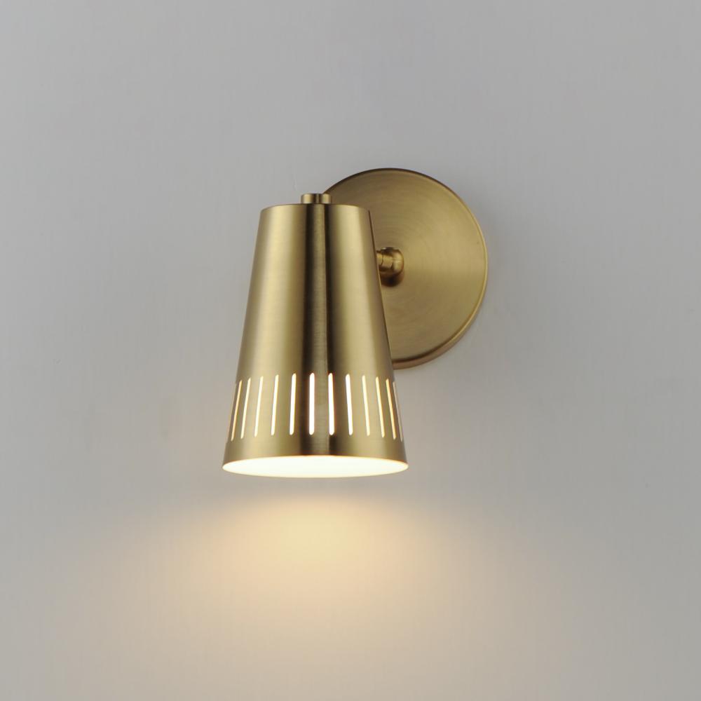 A retro re-imagining of perforated brass shades, this collection is inspired by Scandanavian Mid-Century Modern design. The conical forms feature cut outs along the edge of the shade allowing light to illuminate downward in a spectacular lighting effect. O