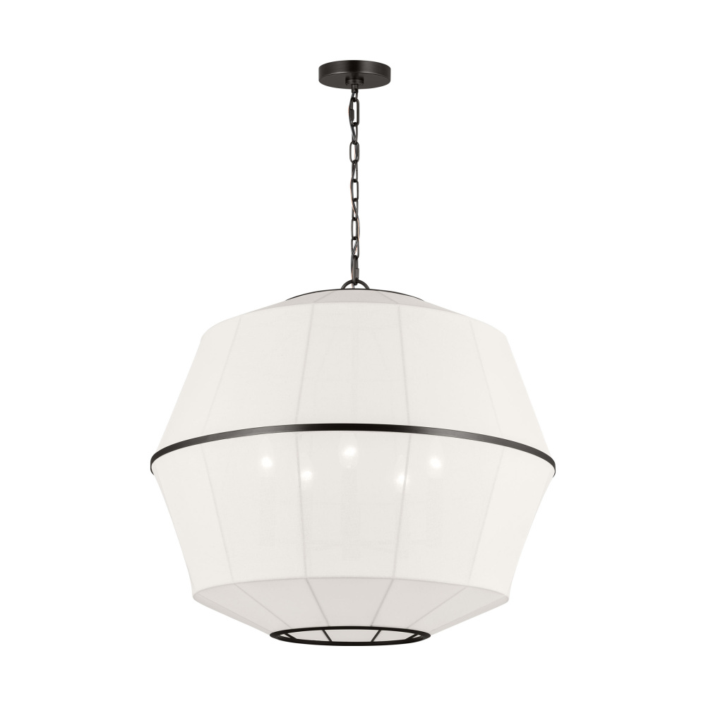 Showcasing multifaceted geometry, the Hikari series by Ellen DeGeneres is inspired by her personal collection of sculptural lighting. Grounded by the contrast of hard and soft materials, the aged iron and white linen fixture radiates soft, diffused light. The Hikari pendant can be used in a dining room, living room, bedroom or entryway.