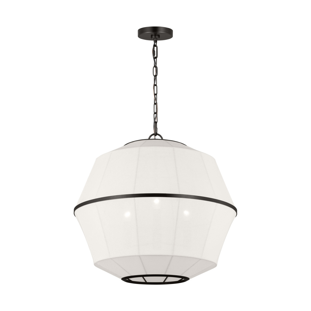 Crafted with Steel in a Aged Iron finish with white linen shades