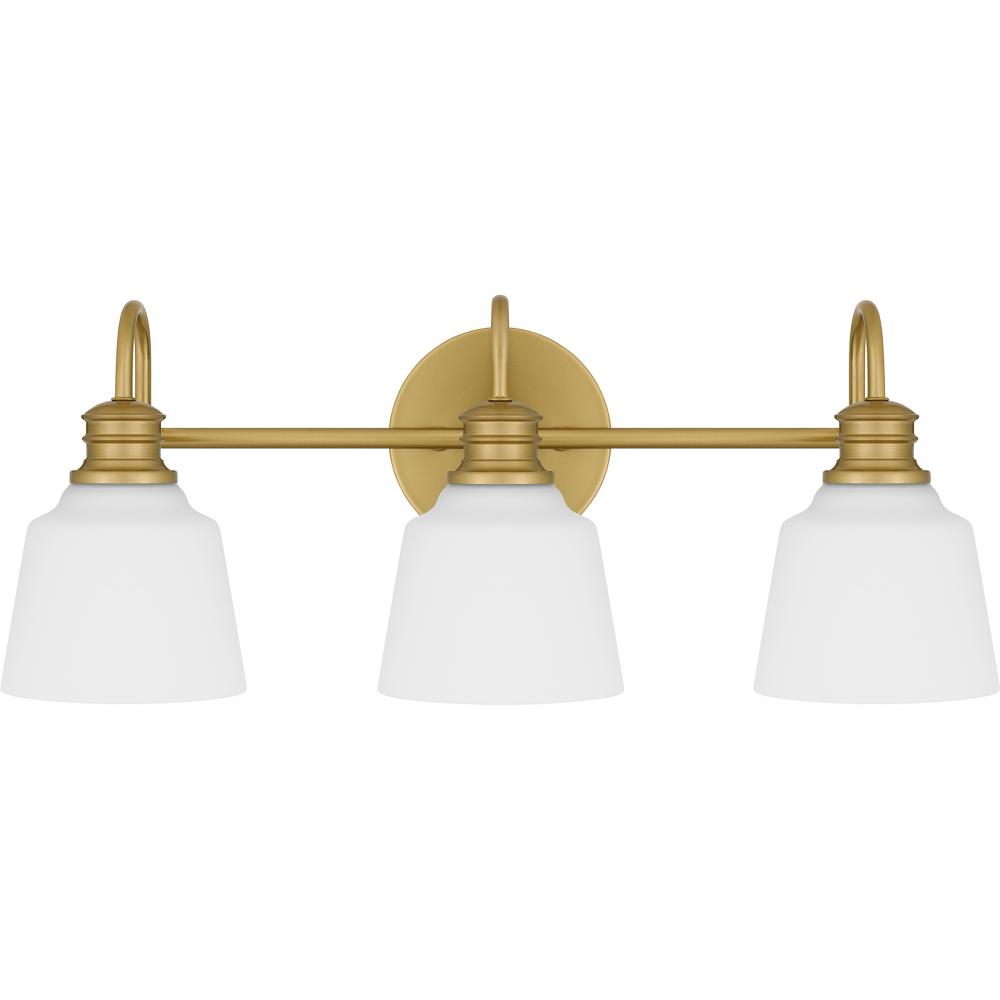 Upgrade any bathroom vanity with the Hinton bath light. Opal etched glass shades cast a soft and ambient glow, setting the mood for an intimate home spa experience. This versatile and traditional design is finished in aged brass for added shine. Configure