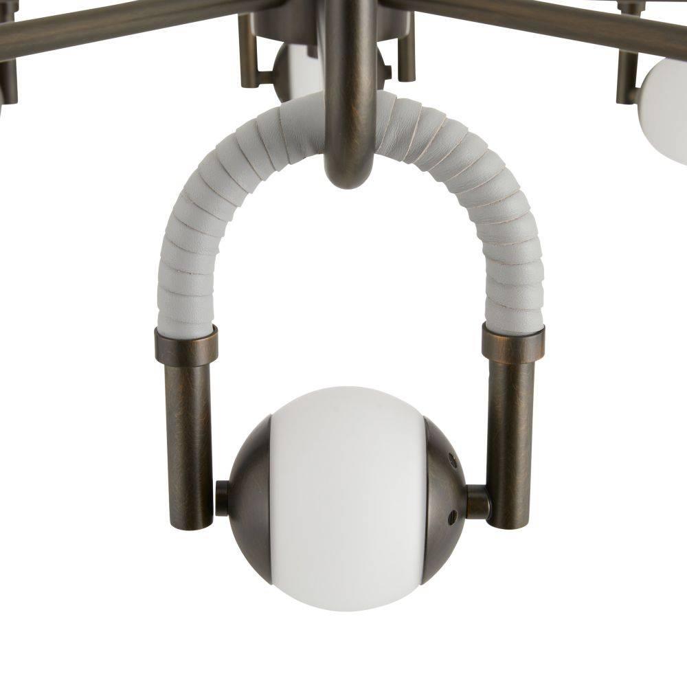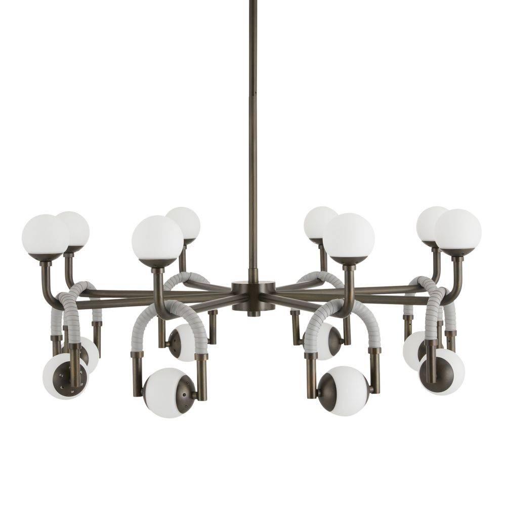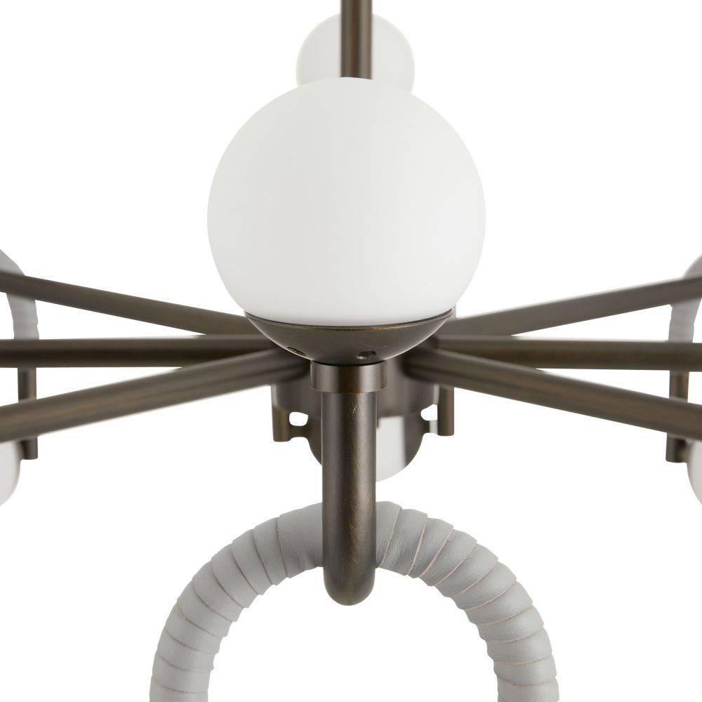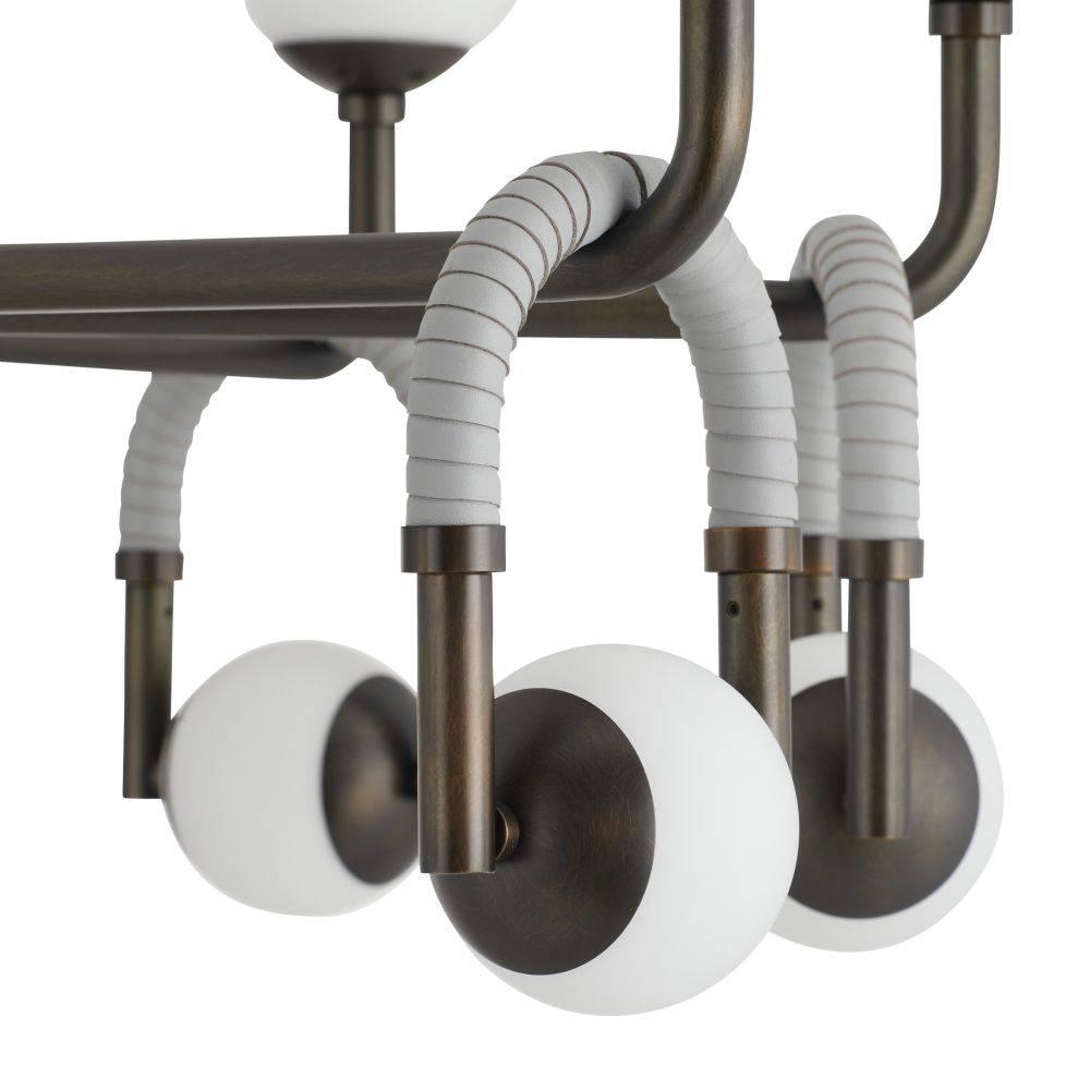 Inspired by the Memphis Group, the interlocking forms of this playful fixture deliver maximum glow. Forged of English bronze-plated steel, each tailored loop is detailed with anchor gray leather accents. Opal glass globes hold eight LED lights. Damp-rated, although limited covered outdoor areas may affect finish. Finish will vary.