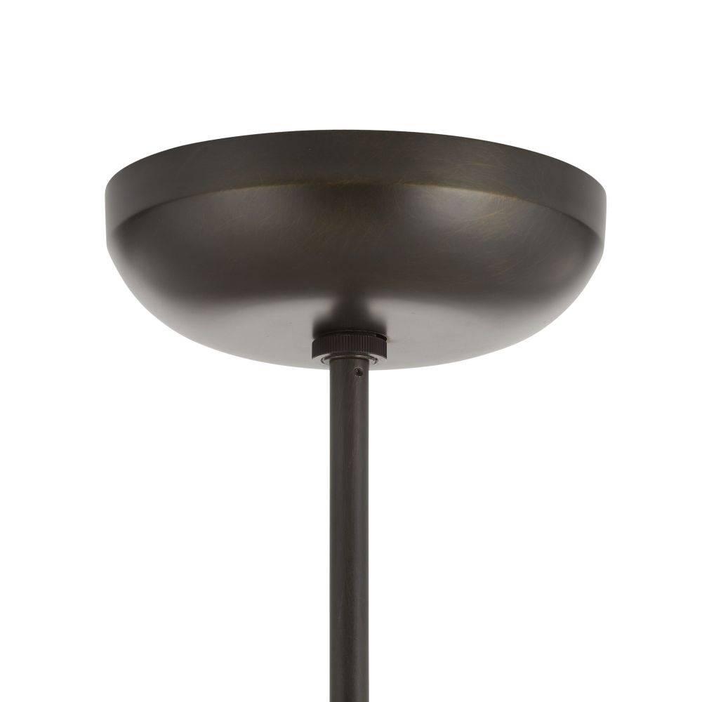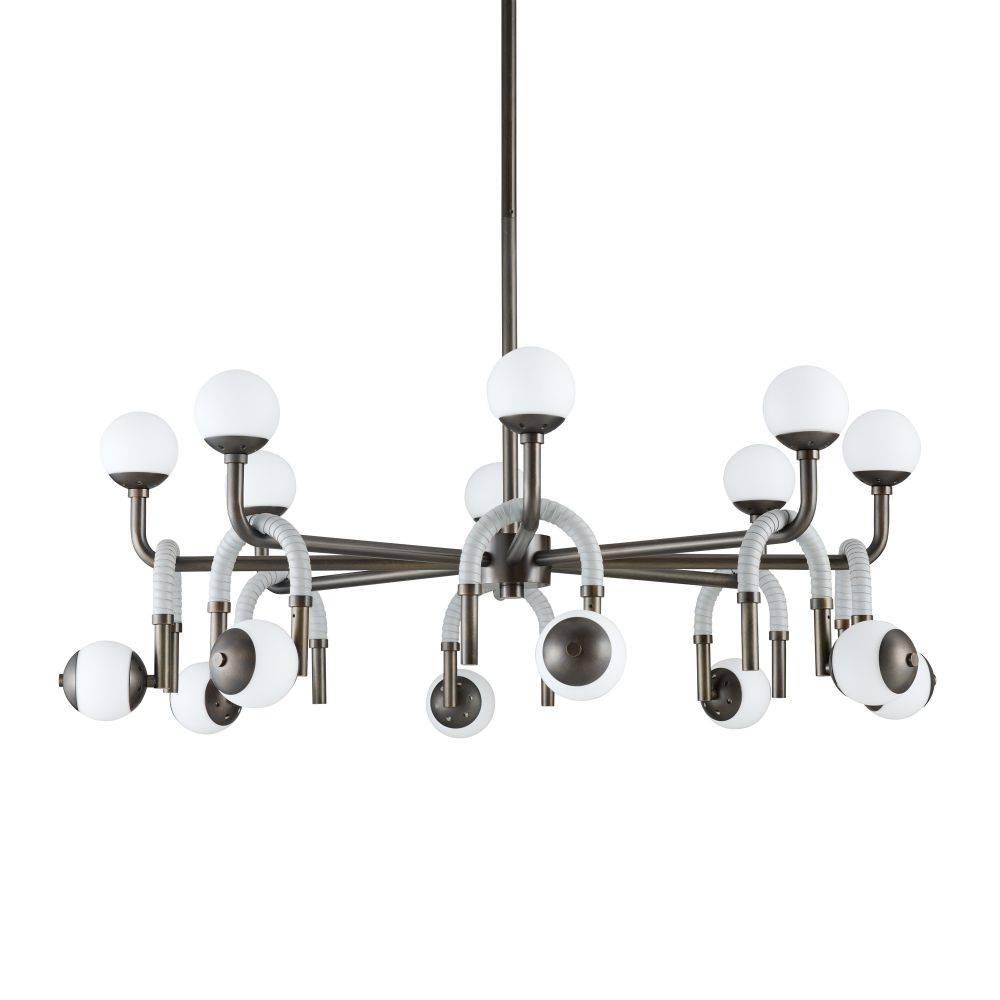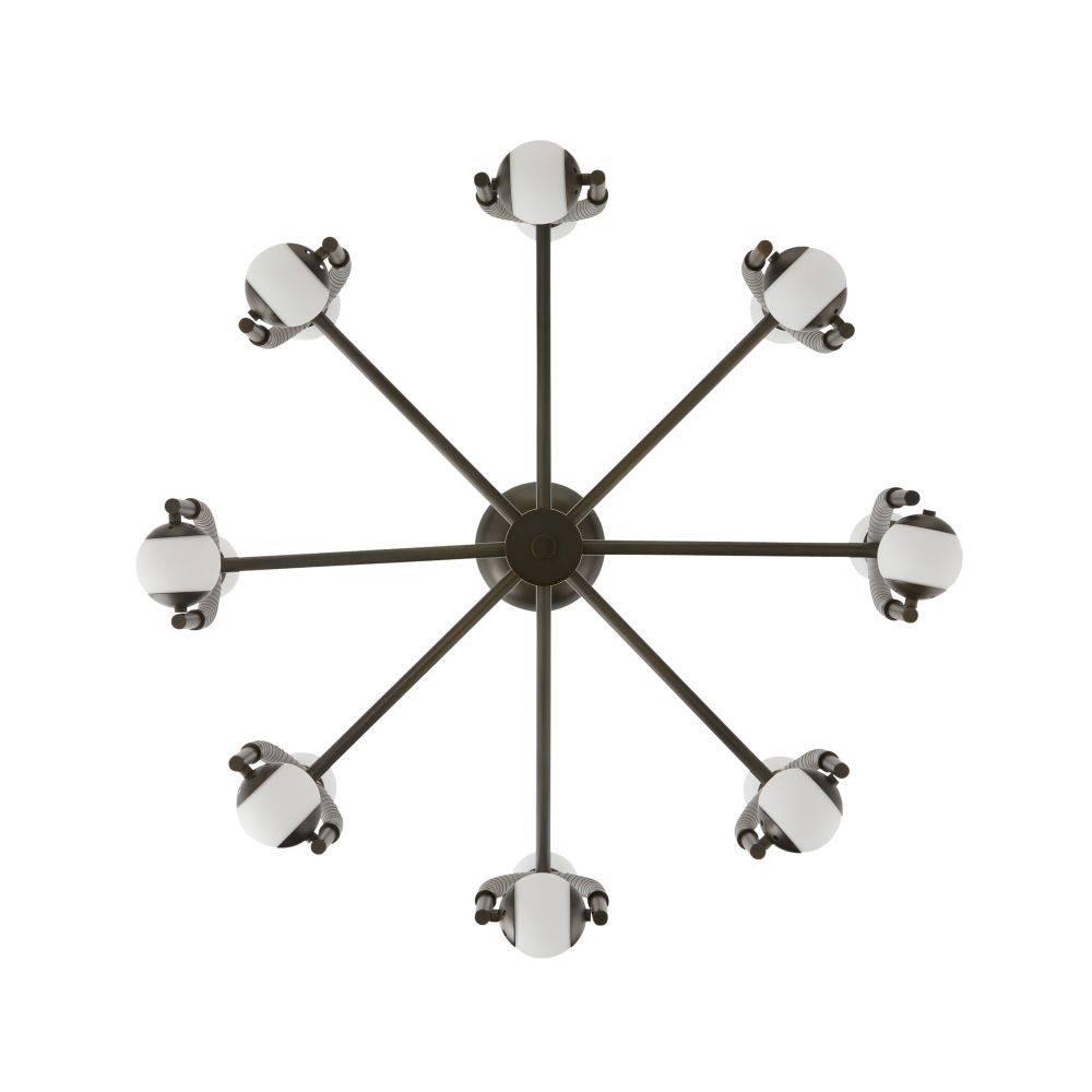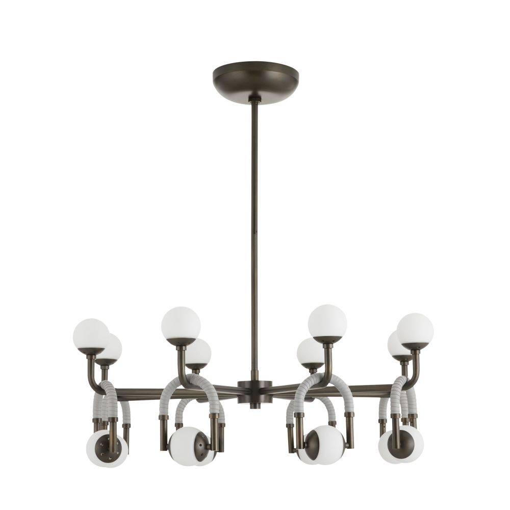 Inspired by the Memphis Group, the interlocking forms of this playful fixture deliver maximum glow. Forged of English bronze-plated steel, each tailored loop is detailed with anchor gray leather accents. Opal glass globes hold eight LED lights. Damp-rated, although limited covered outdoor areas may affect finish. Finish will vary.