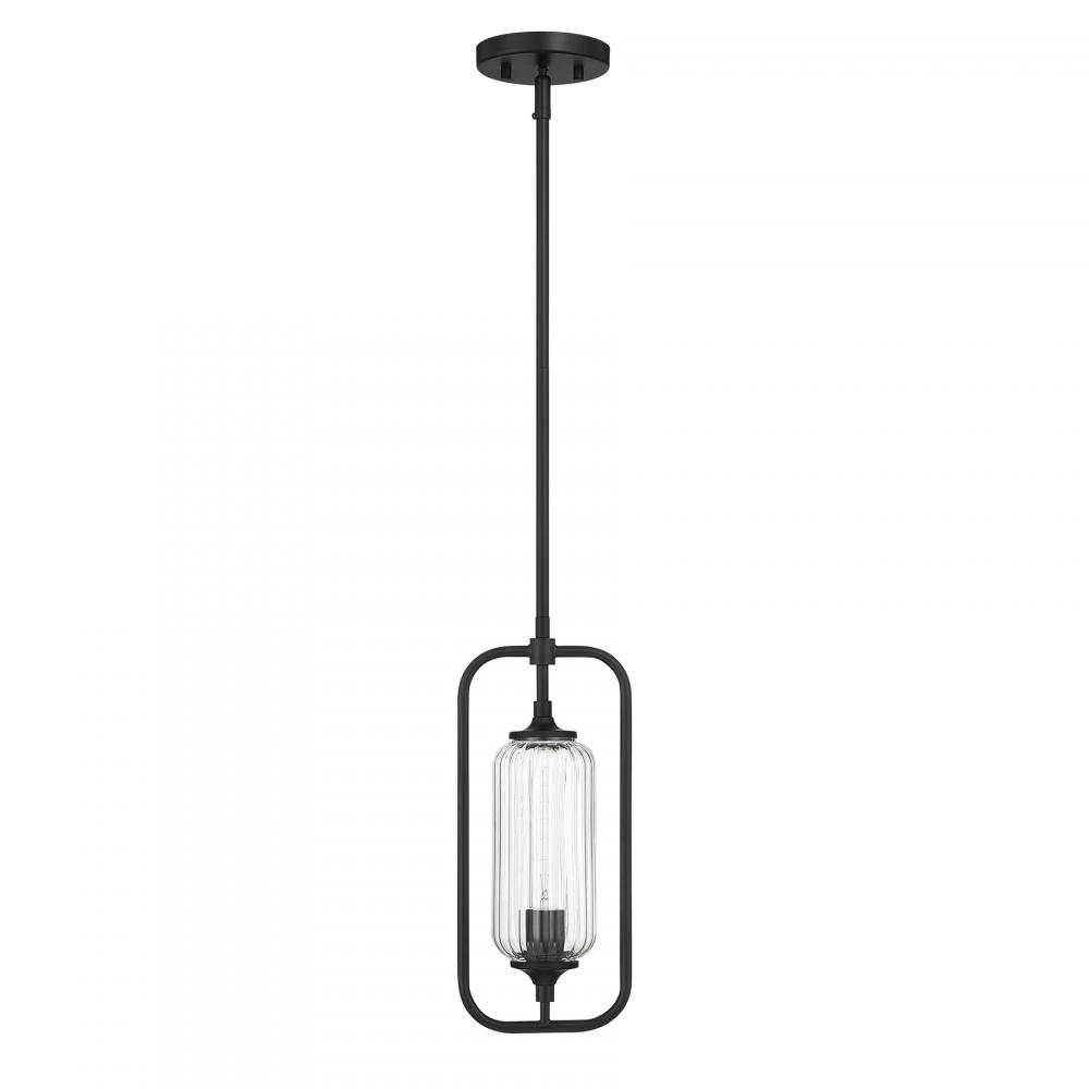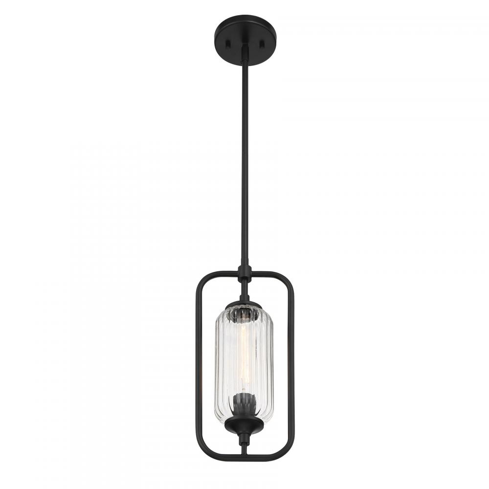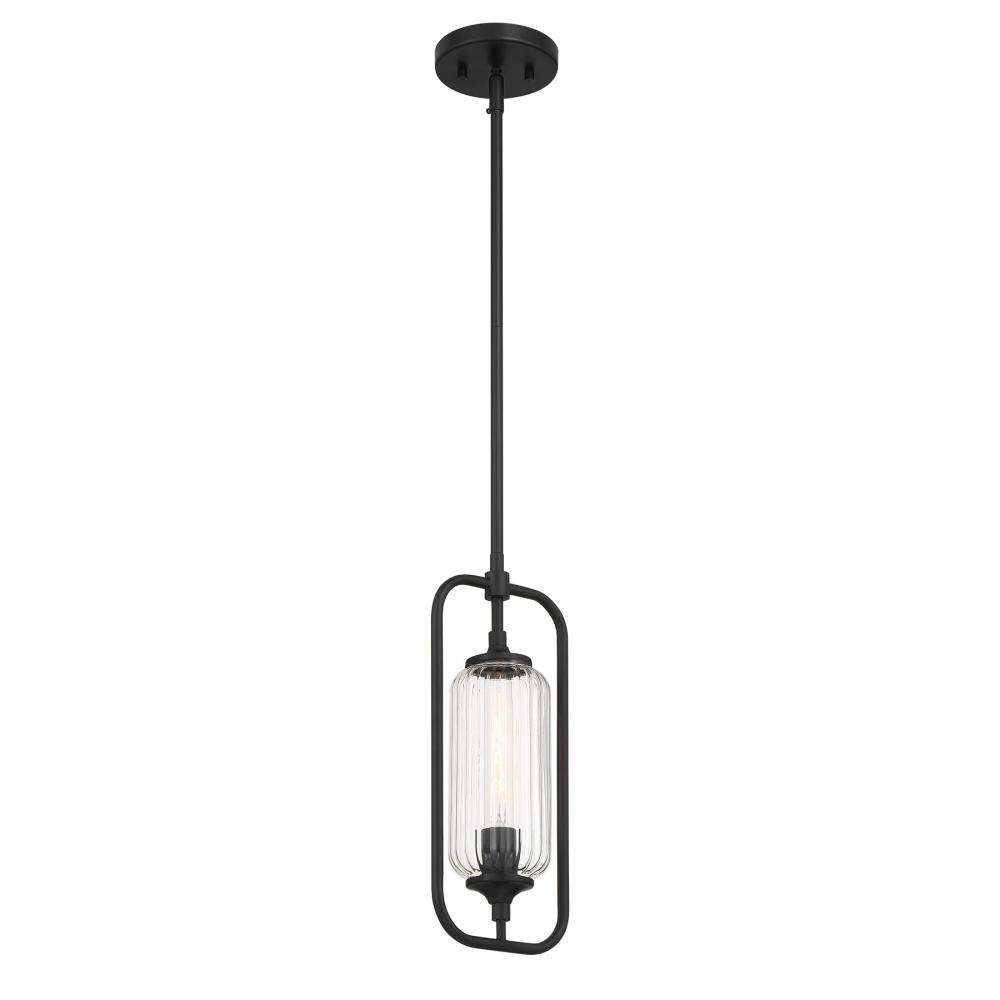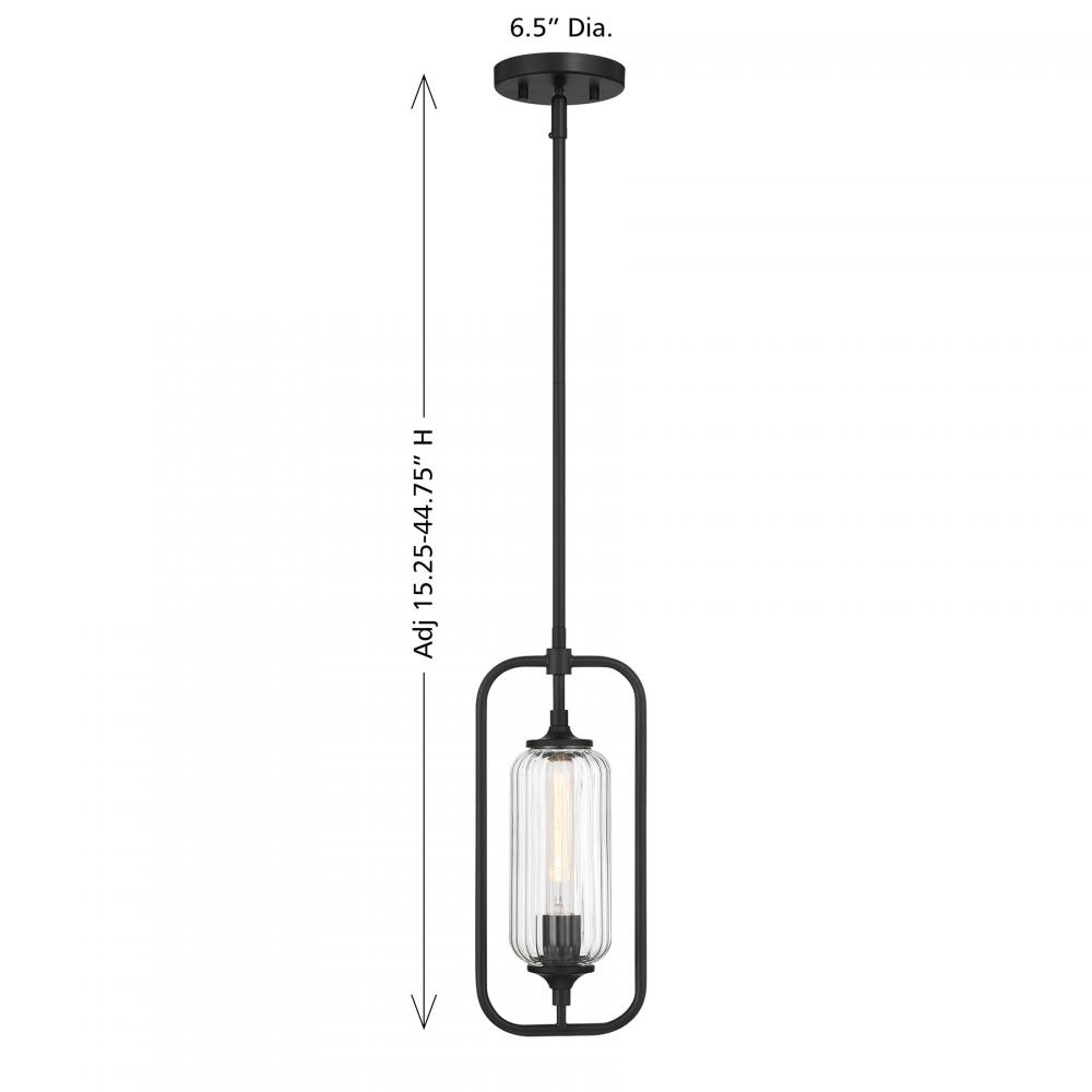 The Savoy House Holton 1-light mini pendant showcases an inventive and geometric style with a tall, rounded shade of clear ribbed glass and a slim, rounded structure finished in Matte Black. It will bring a big dose of style to any space! Holton is 6.5" in width and has an adjustable height ranging from 15.25" to 44.75". It uses one standard size bulb of up to 60 watts. Bulb not included. Comes with three 9.5" downrods.