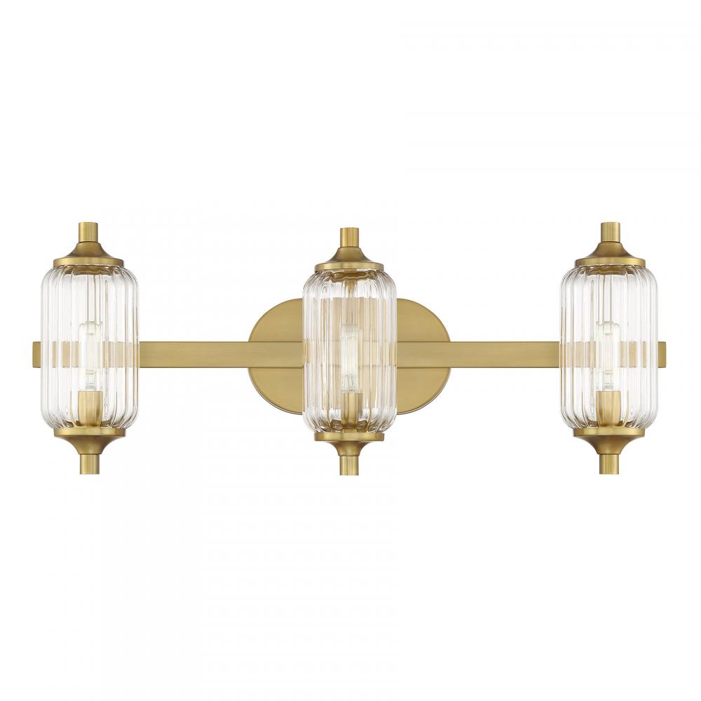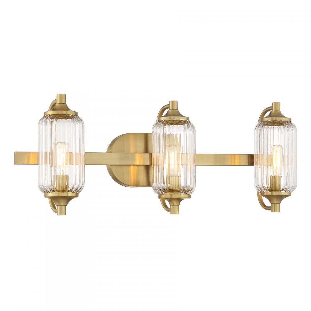 The Savoy House Holton 3-light bath light showcases an inventive and geometric style with tall, rounded shades of clear ribbed glass and a slim, rounded structure finished in Warm Brass. It will bring a big dose of style to any bathroom! Holton is 9" in height, 24" in width and extends 6.75" from the wall. It uses three candelabra size bulbs of up to 60 watts per bulb. Bulbs not included. Install as shown. This bath bar is damp area rated.