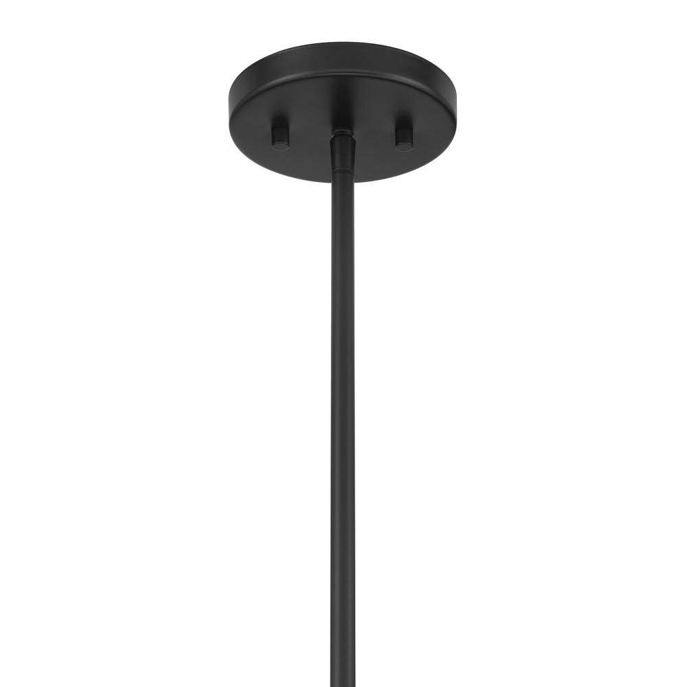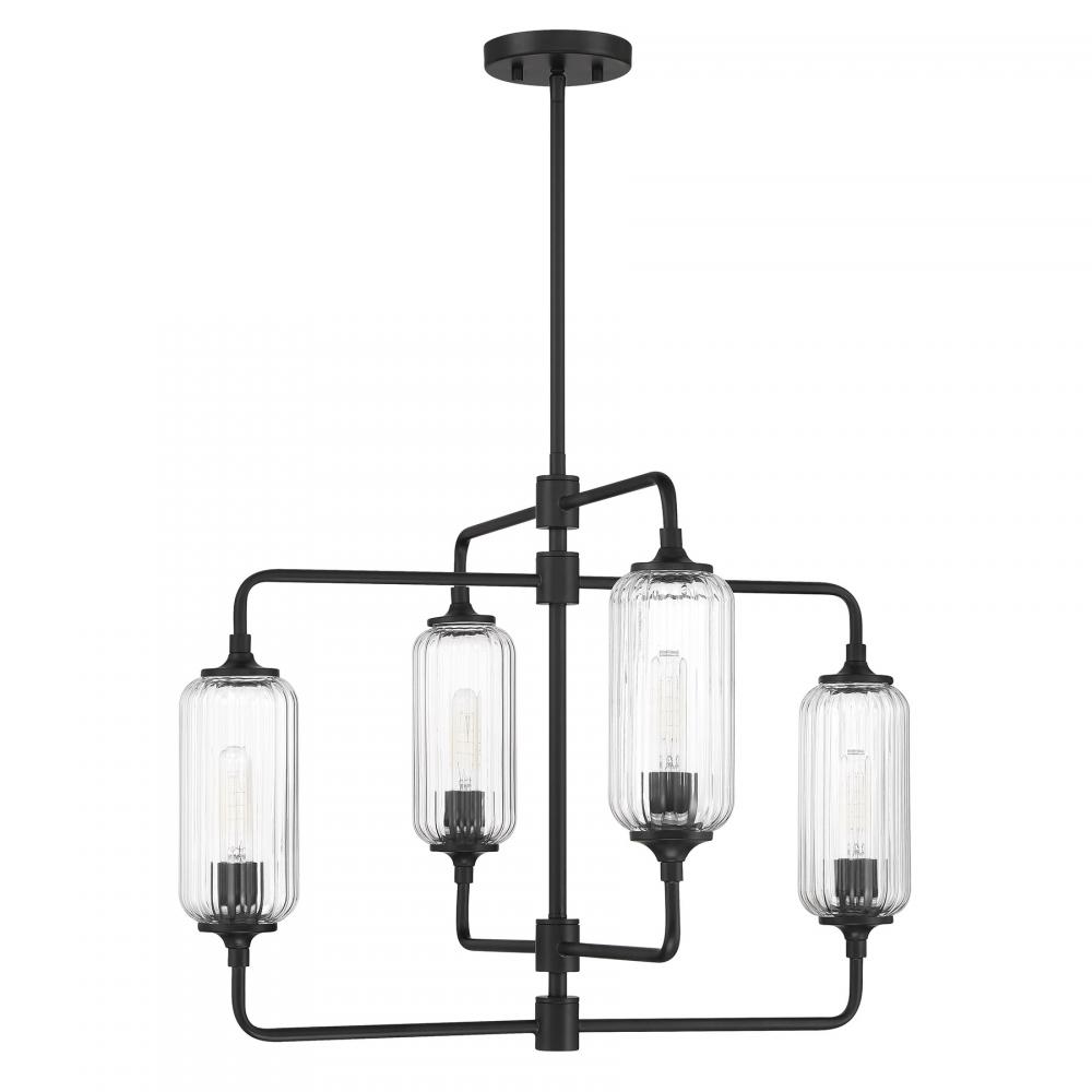 The Savoy House Holton 4-light chandelier showcases an inventive and geometric style with tall, rounded shades of clear ribbed glass and a slim, rounded structure finished in Black. It will bring a big dose of style to any space! Holton is 26" in width and has an adjustable height ranging from 20.25" to 74.25". It uses four standard size bulbs of up to 60 watts per bulb. Bulbs not included. Comes with four 12" downrods and one 6" downrod.