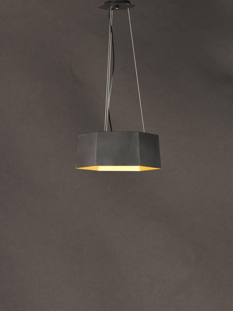 A series of hexagonal metal shades are slightly tapered to create a gentle arc when suspended together. The dramatic combination of Black with Gold interior adds flair to this unique and bold design. Ample illumination is provided by high power integrated LED and softened by acrylic diffusers recessed into each compartment.