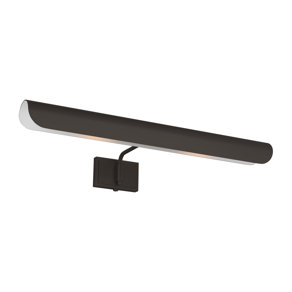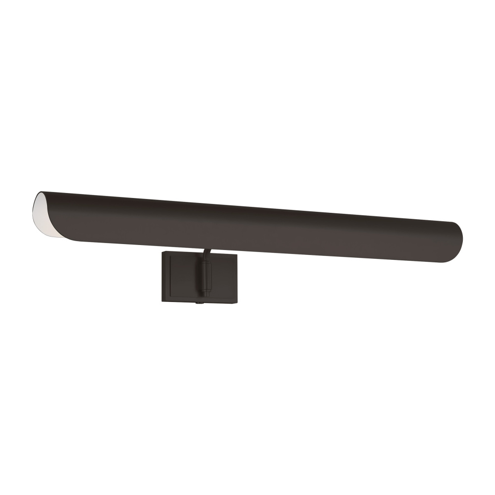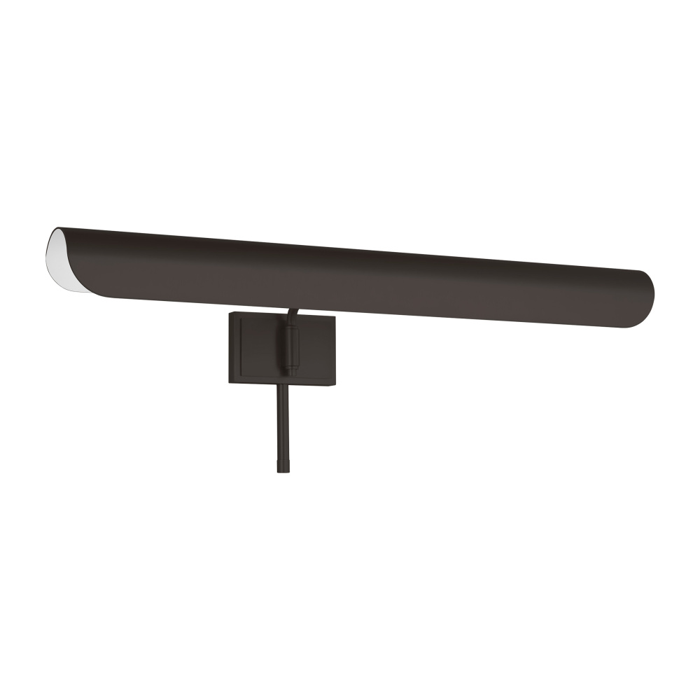 Inspired by a ship's outer hull, the Hull series by Chapman & Myers has a unique shade of these picture lights made from a single piece of metal bent into a cylindrical form. These picture lights have an open-ended design directing light both down and to the sides. A subtle horse saddle design and double barrel back-plate detail that pivots in the direction needed. Available in three sizes and two finish options.