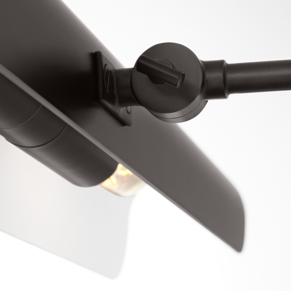 Transitional fixture with pivoting aged iron steel shade will provide light to highlight any piece