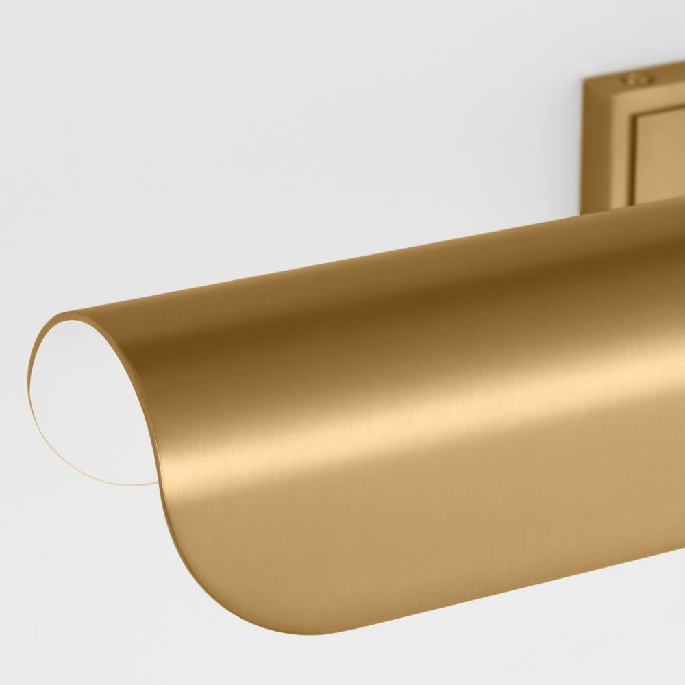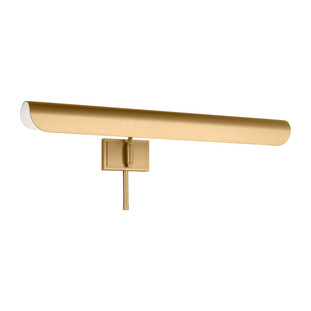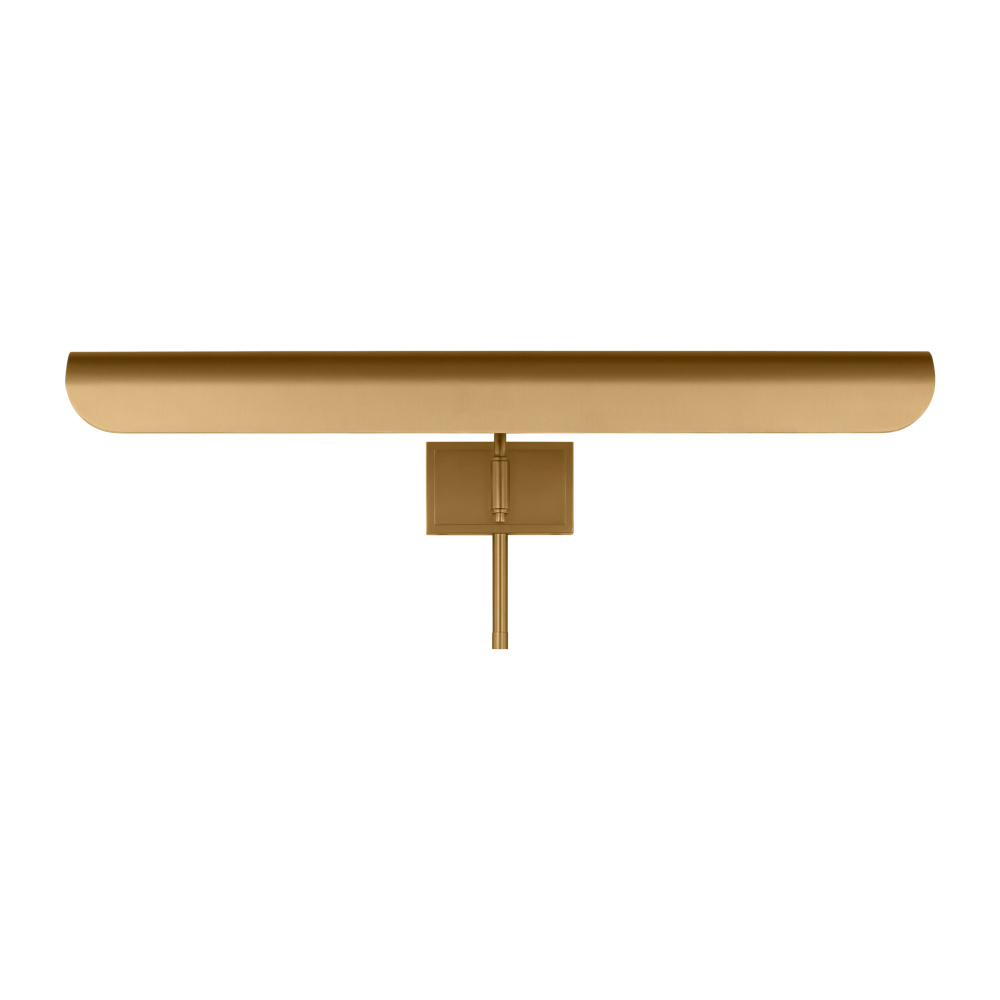 Inspired by a ship's outer hull, the Hull series by Chapman & Myers has a unique shade of these picture lights made from a single piece of metal bent into a cylindrical form. These picture lights have an open-ended design directing light both down and to the sides. A subtle horse saddle design and double barrel back-plate detail that pivots in the direction needed. Available in three sizes and two finish options.