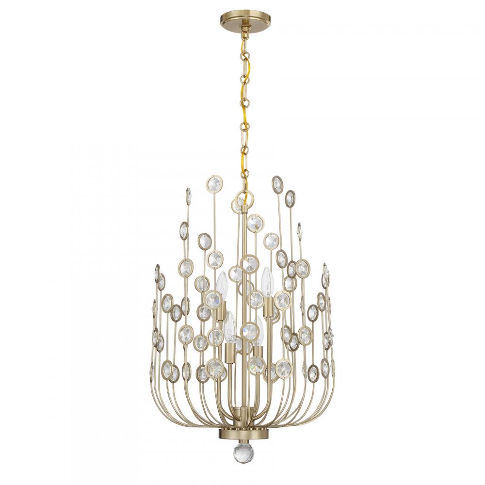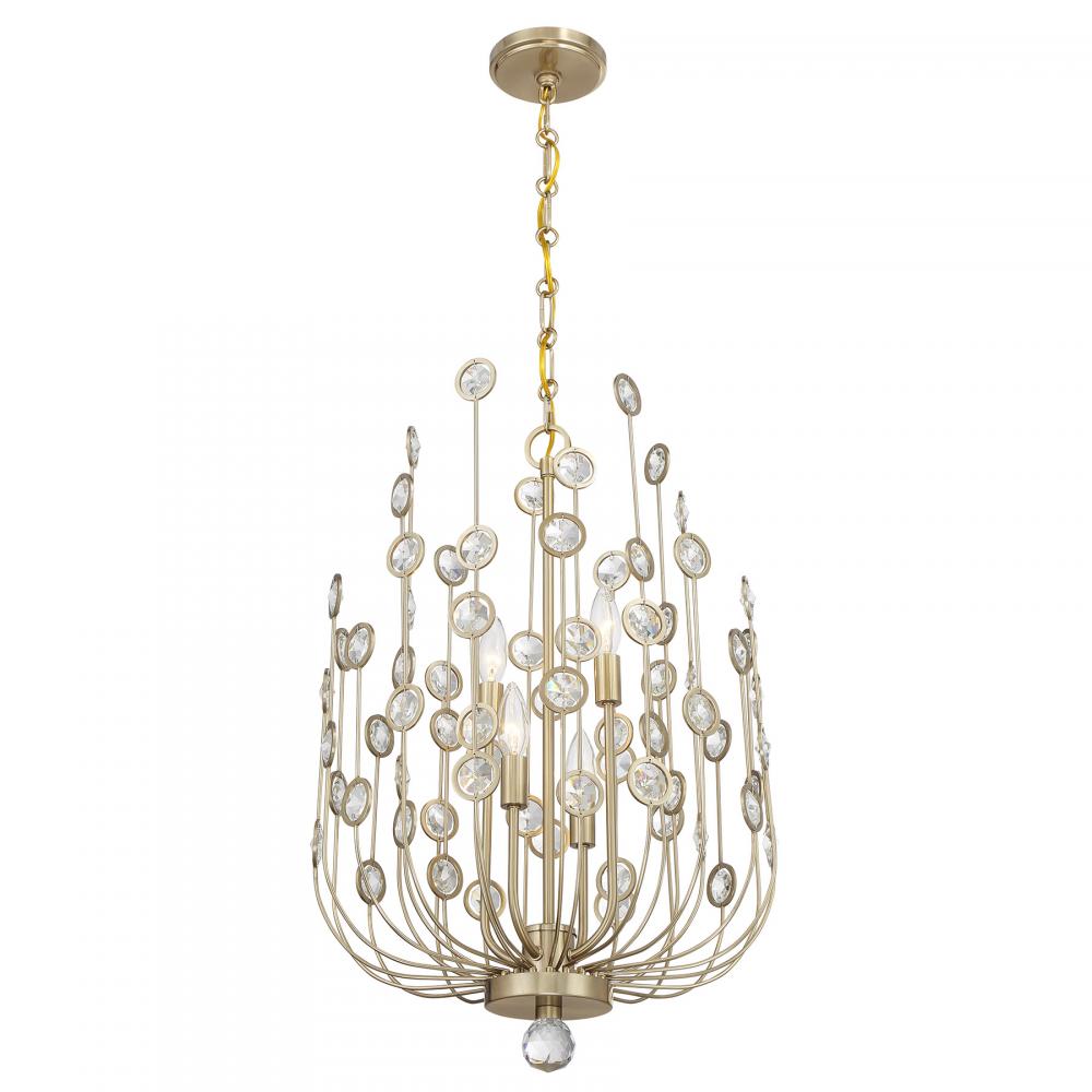 Unique, intriguing and eye-catching, the Savoy House Irina 4-light foyer light is sure to steal the show. Long, lean arms curve up and reach for the sky, finished in shimmering Noble Brass and adorned with octagons of faceted clear crystal held inside circular frames. Irina is 26" in height and 18" in width. Uses four candelabra size bulbs of up to 60 watts per bulb. Bulbs not included. Comes with 120" of chain.