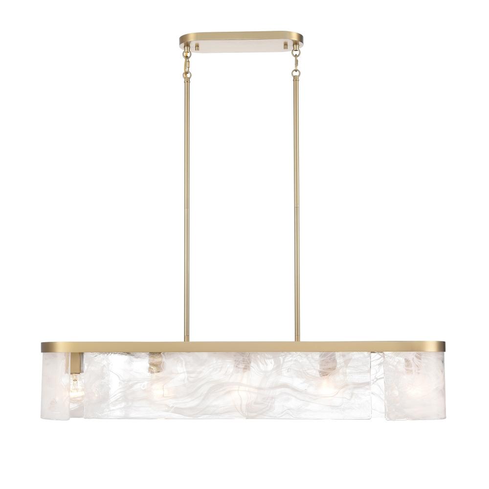 This stunning linear chandelier exudes timeless elegance, blending a brushed brass frame with the ethereal beauty of wispy white Murano-style glass panels. Its cylindrical silhouette radiates sophistication, creating a soft, ambient glow perfect for intimate spaces. The craftsmanship of the Skye collection by designer Kevin Kraemer is evident in the graceful harmony between its materials and design. This piece serves as both a functional light source and a work of art, elevating any room with its luxurious charm. (Comes with extra rods to be hung at the perfect height)
