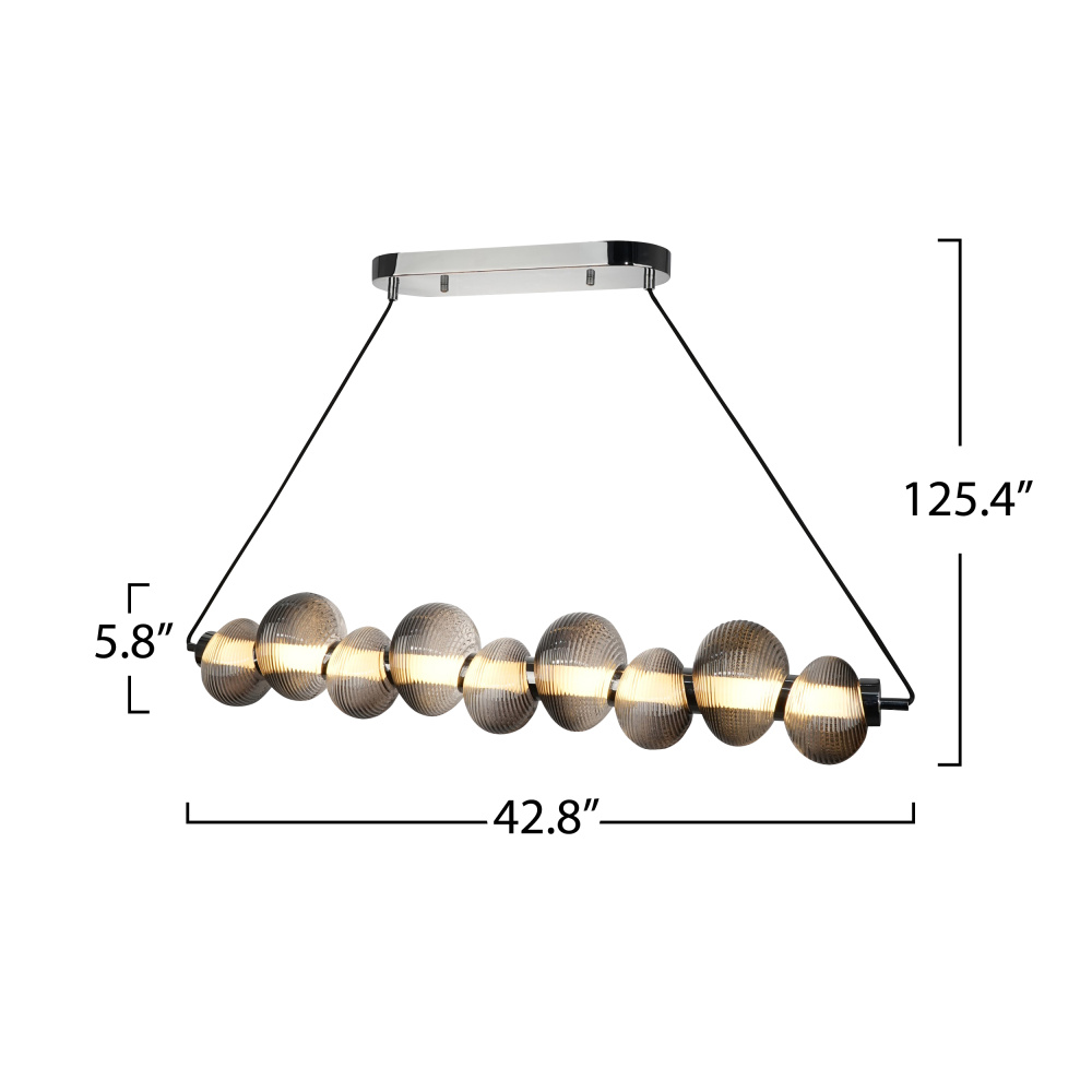 The Ariel Collection LED linear chandelier is a striking fusion of contemporary design and refined sophistication. Its ribbed smoke ombre reflective glass encases a radiant LED white tube, creating a captivating interplay of light and shadow. Complemented by sleek chrome accents and a black-plated frame, this height-adjustable design adds a touch of elegance and adaptability to any setting.