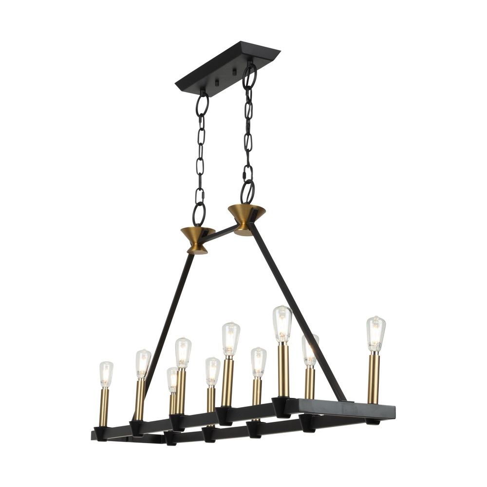 Created by designer Kevin Kraemer, the Notting Hill collection showcases a sophisticated design with black metal frames, exquisitely complemented by brass candle covers and accents. The combination of these finishes adds a touch of elegance and modernity to the collection, creating a visually striking and stylish visual. The use of specific elements highlights Kraemer's attention to detail and commitment to creating unique, contemporary pieces. The 10 light linear island chandelier is shown. (Height adjustable via chain)