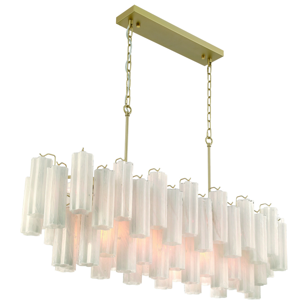 The linear island chandelier from the Sophia collection captivates with its cascading arrangement of ornate “Tronchi” style Wispy White glassware, reminiscent of shimmering icicles. Each glass element delicately refracts light, creating an enchanting glow, while the warm brass frame provides a refined contrast, evoking a sense of luxury. Perfect for classic and modern interiors alike, this design transforms any space into a haven of timeless beauty.