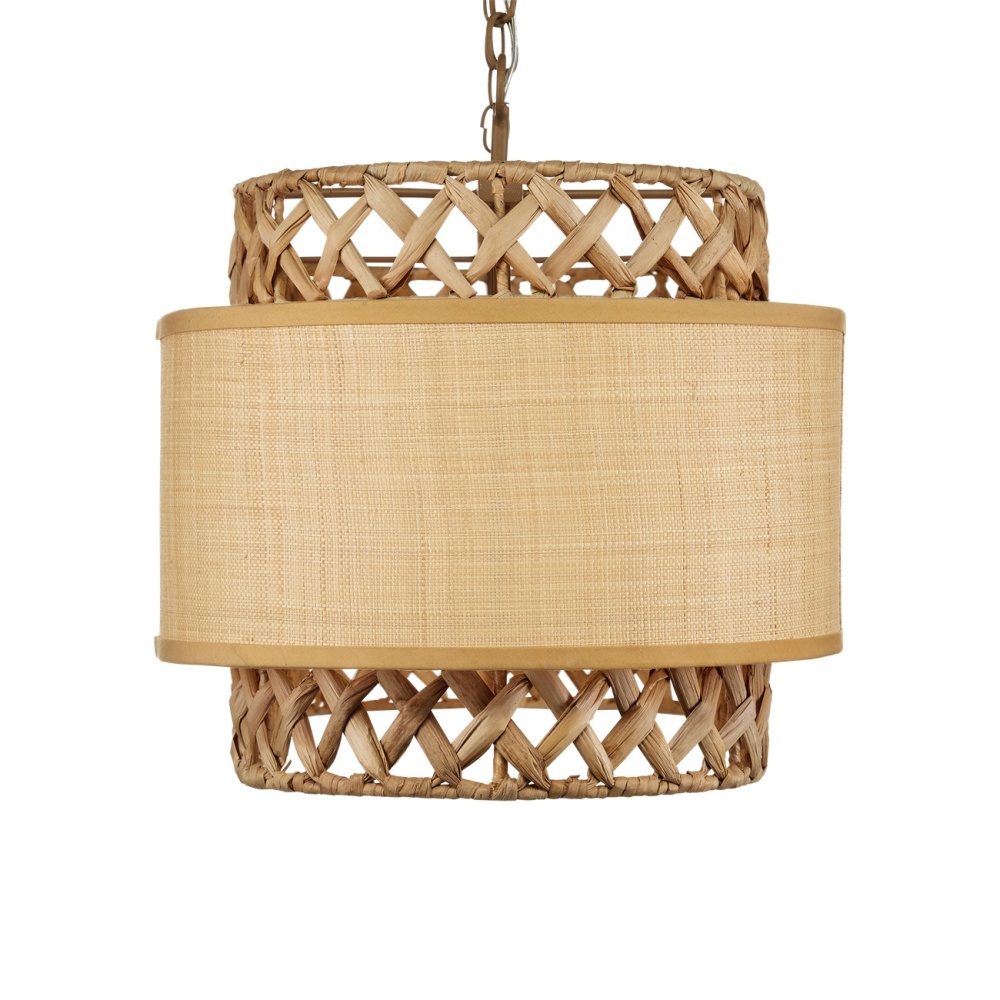 The natural material story continues with the Isola Chandelier with its wrought iron frame in a khaki finish and mix of natural water hyacinth and grasscloth fabric. The smaller, taller oval that encircles the light has a rough luxe weave of the water hyacinth; while the wider, shorter oval has a tighter weave that juxtaposes the looser crosshatching on this tan chandelier. A design detail of note is that the seams match up when the outer shade transitions from straight to curved. Adjustable from 34" to 100" with use of included chain/rod kit/cable. If your space calls for a longer drop, additional chain/rods/cable is available for purchase.