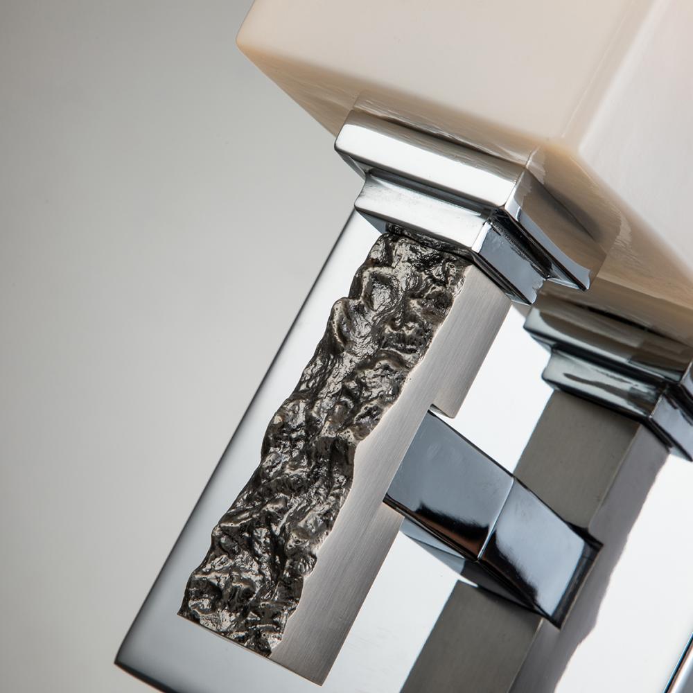 Jack 1 Light Bath Bar in Polished Chrome has rectangle shaped Opal glass shades. The smooth finish with the textured detailing creates a unique lighting masterpiece.