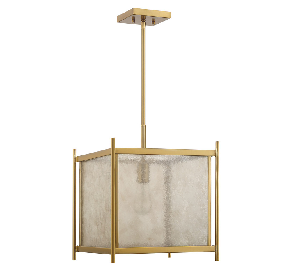 Create a warm and welcoming glow with the geometric chic Savoy House Jacobs 1-light pendant. The clear mica glass shade pairs beautifully with the Warm Brass finish and imparts eye-catching texture. Jacobs is 14" in width and has an adjustable height ranging from 17.5" to 71.5". Comes with four 12" downrods and one 6" downrod. Uses one standard size bulb of up to 60 watts. Bulb not included.