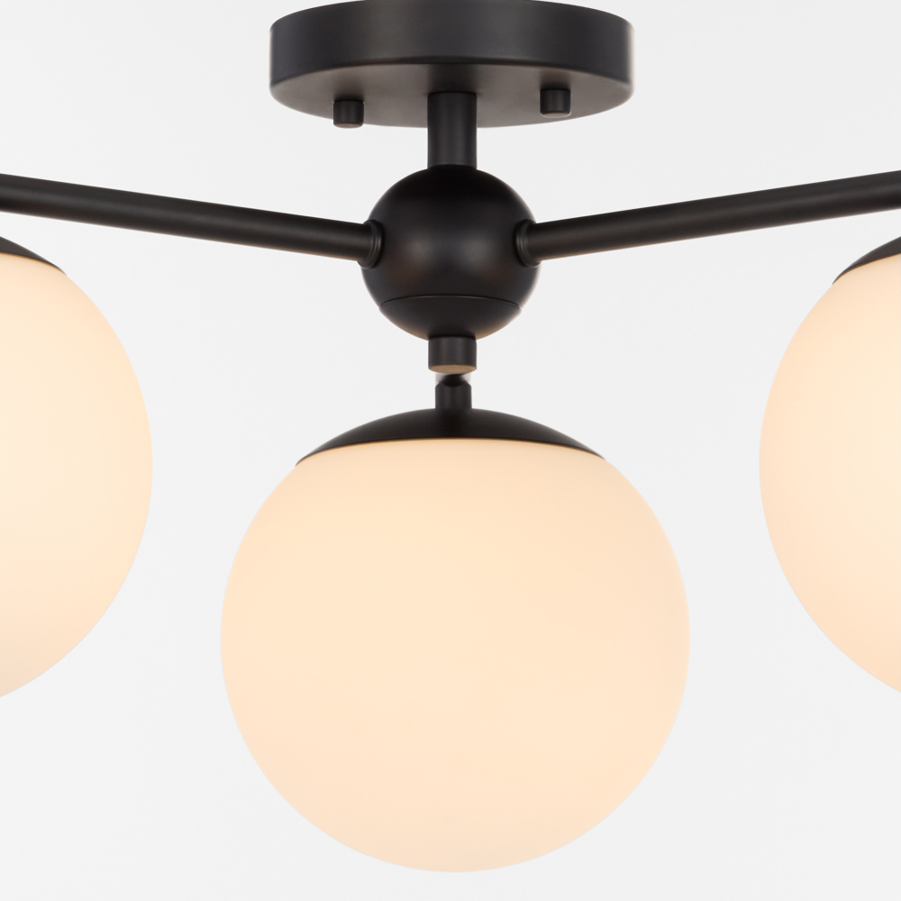 Part of the Main Street collection, the Jasper collection showcases a modern hub-and-spoke design with round globe shades and clean symmetry. Available in matte black or satin nickel and offered in both 3-light and 6-light configurations, it’s designed to suit a range of modern interiors.